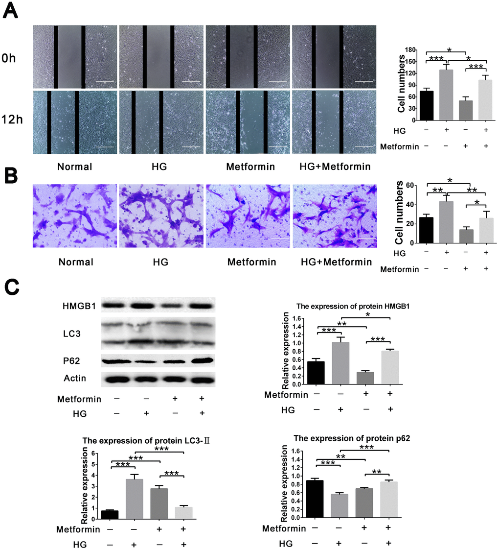 HMGB1 is an inflammatory factor that increase VSMC proliferation and high glucose–induced calcification in VSMC and subsequent vascular inflammation and atherosclerosis [4, 28, 29]. In addition, HMGB1 has been identified as an autophagy sensor in oxidative stress [30], and autophagy may regulate the expression and release of HMGB1 [31]. However, increasing evidences indicates that HMGB1 is downregulated by metformin [23]. In our previous studies, we found that metformin induced autophagy by activating AMPK, resulting in decreased proliferation and migration of endothelial progenitor cells [32, 33]. In the present study, we also found that metformin inhibits the proliferation and migration of VSMC induced by elevated glucose. This might be related to the autophagy pathway promoted by metformin.