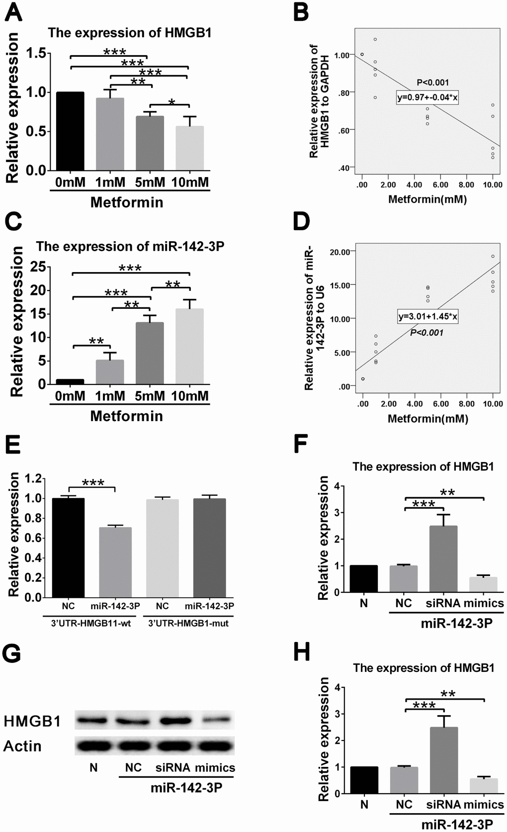 All statistical analyses were performed using SPSS v21. Data are presented as mean ± SD. Student’s t test or one-way ANOVA was used to examine the differences between the groups. Correlations between HMGB-1 and miR-142-3p levels and metformin concentration were analyzed using the Pearson correlation method. P < 0.05 was considered as statistically significant.