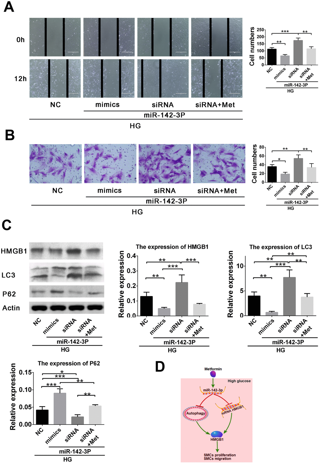 Abnormal proliferation and migration of VSMC, which is enhanced by inflammation in hyperglycemic states, contribute to the formation of atherosclerotic lesions [24]. According to previous studies, metformin attenuates early-stage atherosclerosis in mildly hyperglycemic Oikawa-Nagao mice [17]. This may be due to the inhibition of the inflammatory response and vascular calcification in VSMC by metformin [24, 25]. Metformin also inhibits proliferation of tumor and endothelial cells [26, 27]. In our study, metformin decreased VSMC proliferation in the high-glucose condition. In addition, VSMC migration was also inhibited by metformin. Finally, increased miR-142-3p expression was shown to inhibit VSMC proliferation and migration via the HMGB1-autophagy related pathway (Figure 4D).