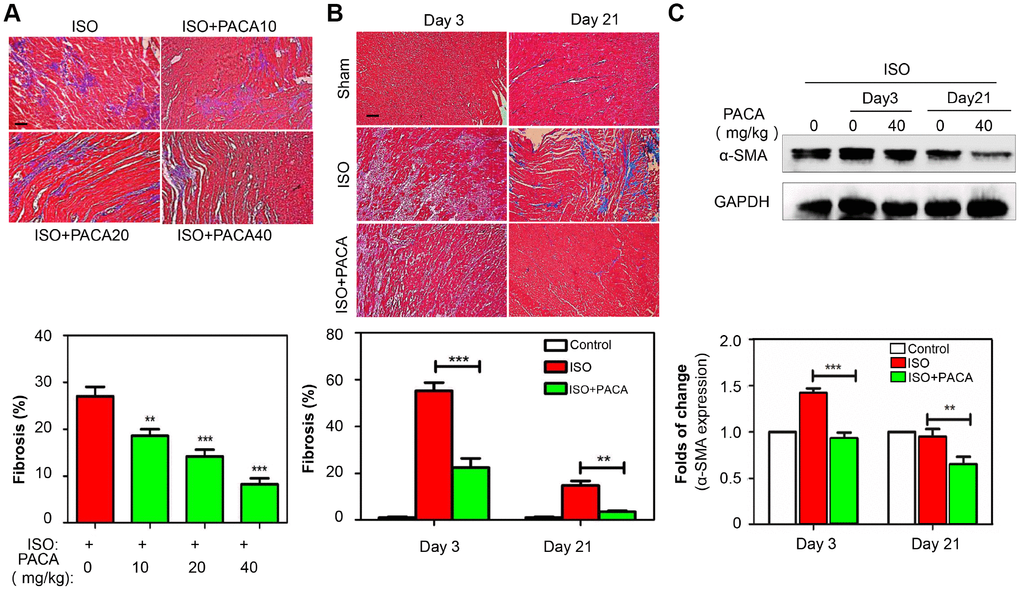 H&E staining was used to examine the pathological changes in the cardiac tissues. As shown in Figure 1A and 1B, almost no broken fibers and inflammatory cells were detected in myocardium from the control group while myocardial cells from the ISO group showed an irregular morphology, broken fibers and infiltrated inflammatory cells. Interestingly, PACA ameliorated the breakage of myocardial fiber and the infiltration of inflammatory cells somewhat in a dose-dependent manner (data not shown). Importantly, PACA at 40 mg/kg significantly suppressed ISO-induced increase in the density of blue-stained collagen fibers between myocardial cells. To determine the effect of PACA on the progression of cardiac fibrosis, we detected the fibrotic biomarker collagen and α-SMA by staining the heart tissues by Masson’s trichrome and monitoring protein levels in a time course. As shown in Figure 1C and 1D, fibrosis in ISO group was readily detectable on day-3 and became more severe on day-7 although fibrosis was resolved to a certain extent on day-21. However, PACA treatment attenuated fibrosis on day-3, day-7 and day-21. On the other hand, ISO increased the protein levels of α-SMA whereas PACA significantly reduced the contents of α-SMA protein on day 3 and day 21 (Figure 1E and 1F).