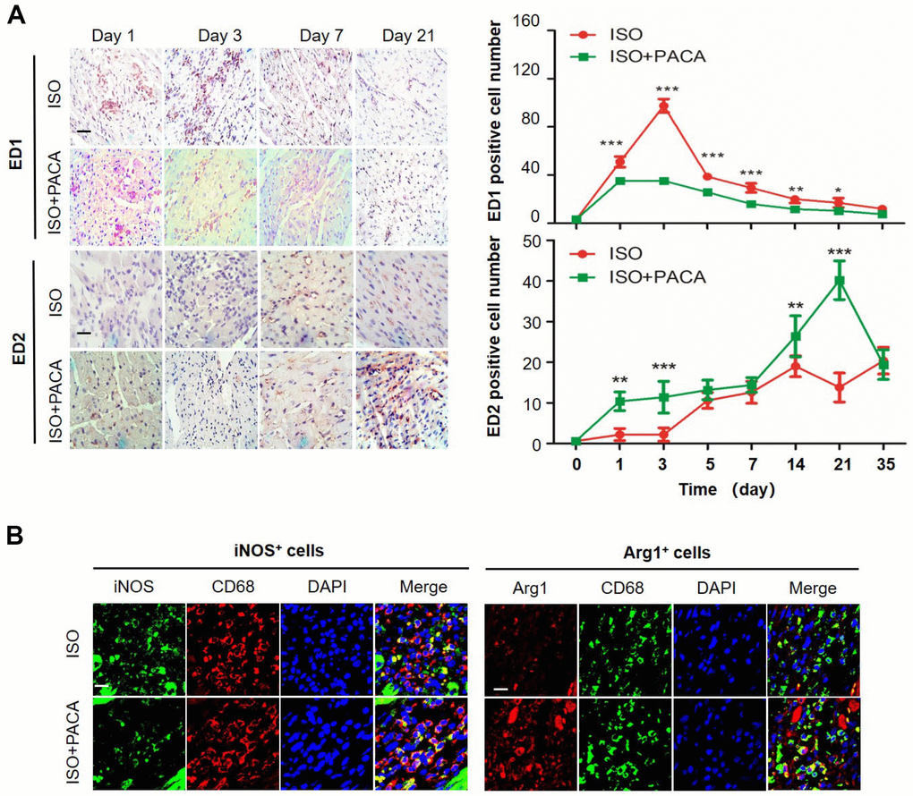 To examine the kinetics of macrophage polarization in the hearts, we monitored the expression levels of macrophage biomarkers ED1 and ED2, respectively. As shown in Figure 2A, ISO stimulated the expansion of ED1+ cells within and around the affected myocardium. Specifically, the number of ED1+ cells was increased from day-1, peaked on day-3. Although rapidly declined after the peak, ED1+ cells were still detectable even by day-35. By contrast, As shown in Figure 2A, ED2+ cells showed different kinetics from ED1+ cells. Although ED2+ cells were barely detectable on day-1 and day-3, the number of ED2+ cells was increased within the first week after ISO stimulation, peaked on day-14. Interestingly, ED2+ cells showed somewhat decrease by day-21 and remained to be greater than the control level by day 35. However, PACA showed differential effects on ED1+ cells and ED2+ cells. Particularly, PACA reduced ISO-induced accumulation of ED1+ cells from day 1 to day 21 while stimulated the presence of ED2+ cells from day 1 to day 14 and prolonged the peak time of ED2+ cells until day-21. Moreover, the kinetics of ED1+ cells and ED2+ cells were confirmed by staining M1 biomarker iNOS and pro-resolving M2 biomarker Arg1 in the heart tissues. As shown in Figure 2B, PACA markedly decreased the number of iNOS+ cells, while increased the number of Arg1+ cells. In addition, we detected the enzyme activity of arginase 1 in the heart tissues of different groups, while PACA barely affected arginase 1 activity in the heart tissues (not shown).