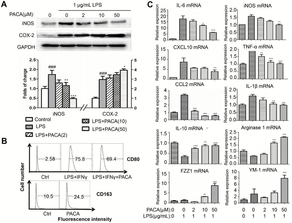 To confirm the effects of PACA on macrophage polarization, we monitored the changes of macrophage M1 and pro-resolving M2a biomarkers (Arg1, FZZ1, YM-1 and IL-10) in LPS-stimulated RAW264.7 macrophages. Firstly, as shown in Figure 3A, PACA selectively inhibited LPS-induced expression of iNOS over COX-2. Secondly, we employed flow cytometry to verify the effect of PACA on the expression of M1 biomarker CD80 and pro-resolving macrophage biomarker CD163. As shown in Figure 3B, PACA reduced the number of CD80+ M1 macrophages from 75.8% to 69.4% against the stimulation with LPS and IFN-γ, while increased the number of CD163+ macrophages from 10.5% to 24.5%. Thirdly, we further determined the effects of PACA on other macrophage biomarkers by qRT-PCR technique. As shown in Figure 3C, PACA effectively suppressed the mRNA expression of M1 biomarkers including IL-1β, CCL2, IL-6, TNF-α, CXCL10 and iNOS induced by LPS in RAW264.7 macrophages. In contrast, PACA profoundly upregulated the mRNA expression of pro-resolving M2a biomarkers (e.g., FZZ1, YM-1, IL-10 and Arg1).