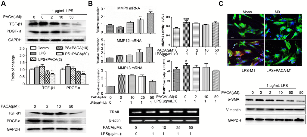 To examine the effects of PACA on cardiac fibrosis, we determined the expression of pro-fibrotic factors including TGF-β1 and PDGF-a in different phenotypes of macrophages. As shown in Figure 4A, PACA markedly reduced the expression of TGF-β1 and PDGF-a both in control cells and LPS-challenged cells in a concentration-dependent manner. Furthermore, we examined the effects of PACA on the factors (e.g., MMP-12 and MMP-13) for tissue remodeling. As shown in Figure 4B, PACA could maintain or slightly increase the expression levels of MMP-12 and MMP-13 in LPS-induced macrophages. And the results of enzyme activities showed that PACA could maintain the activities of LPS-induced MMP12 and MMP 13 in the culture medium. Interestingly, PACA upregulated the expression of MMP-9 and TRAIL in LPS-stimulated macrophages.