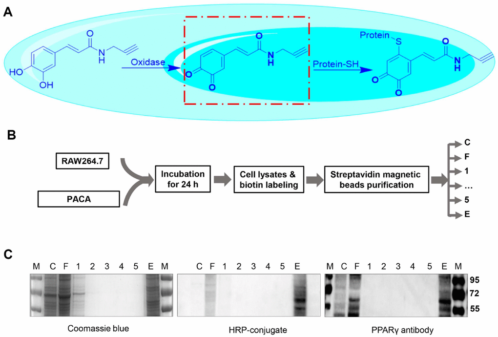 RAW264.7 macrophages (2 × 107) were treated with 50 μ M PACA for 24 h and subsequently lysed in 0.6 mL of RIPA buffer containing protein inhibitor and 100 mM iodoacetate amide, then centrifugated at 13000 rpm for 15 min. After desalting with 10 kDa Microcon® centrifugal filter, the protein mixture was incubated with 100 μ M azido-biotin in a Click chemistry reaction mix including 1 mM sodium ascorbate, 100 μ M tris [(1-benzyl-1H-1,2,3-triazol-4-yl)methyl]amine, 1 mM CuSO4 at RT for 4 h. Following desalting with 10 kDa centrifugal filter, the reaction mixture was incubated with 50 μL streptavidin-coated magnetic beads from Thermo Fisher Scientific (Waltham, MA, USA) at RT for 1 h and at 4 °C for 3 h. The cellular proteins were separated into flow-through (FL), wash fractions 1-5 (W1-5) and elution (E). The resulted fractions were resolved in a 10% SDS-PAGE gel, stained with Coomassie Brilliant blue R-250 from Bio-Rad Laboratories (Hercules, CA, USA), and detected with HRP-streptavidin conjugate. For confirmation, the blot was probed with anti-PPAR-γ primary antibody and detected by HRP-conjugated secondary antibody. The blots were visualized with enhanced chemiluminescence (ECL) detection reagents from GE Healthcare (Uppsala, Sweden).