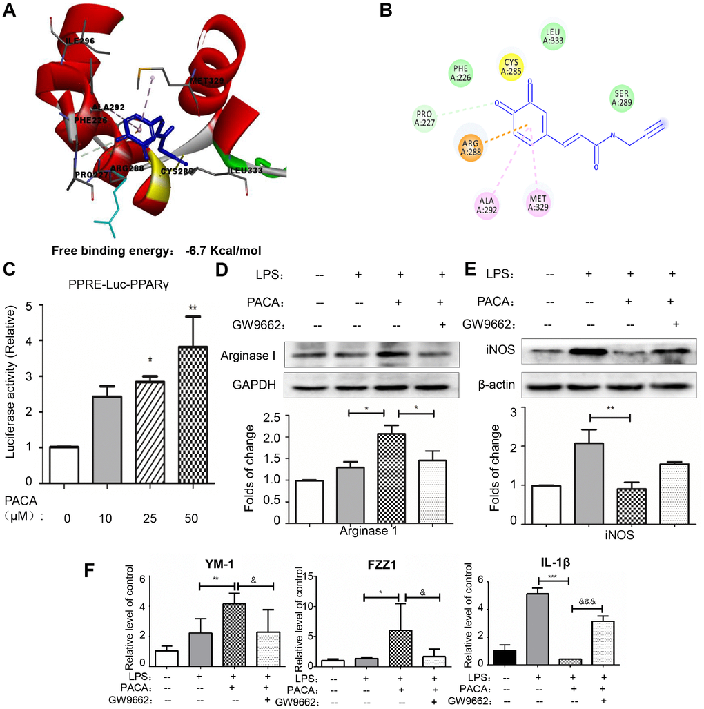 To define the biological importance of covalent PACA-PPAR-γ conjugation, we assayed the promoter activity of PPAR-γ with PPRE X3-TK-luciferase expression system. As shown in Figure 6C–6E, PACA could enhance PPAR-γ luciferase activity in a concentration-dependent manner. PPAR-γ specific antagonist GW9662 effectively suppressed PACA-induced activation of PPAR-γ. Moreover, GW9662 also blocked the effects of PACA on the upregulation of Arg1, YM-1 and FZZ1 in LPS-stimulated macrophages and stopped the reduction of iNOS and IL-1β induced by PACA.
