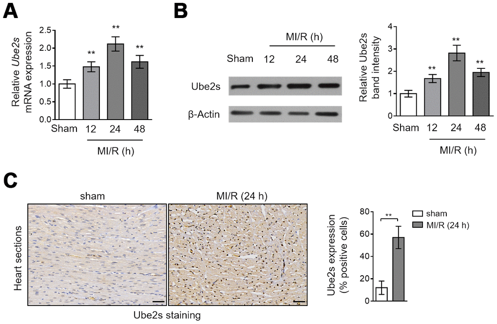 Although the well-established role of Ube2s is cell cycle regulation [13, 17, 18], it was recently reported that Ube2s contains hypoxia-response elements in promoter region and its expression can be induced under hypoxia conditions [19]. Yet, as far as we know, what change Ube2s expression would display after MI/R injury is not investigated. To address it, we compared its expression in the heart tissues collected from mice subjected to sham or MI/R injury. The results obtained from the quantitative reverse transcription PCR (qRT-PCR) analysis showed that compared with sham operation, the transcript level of Ube2s in the heart tissues was increased and peaked at 24 h after MI/R injury (Figure 1A, Supplementary Figure 1A). In addition, similar results could be obtained when comparing Ube2s protein level between sham and MI/R groups through Western blotting analysis (Figure 1B, Supplementary Figure 1B). Moreover, the immunohistochemical staining analysis of the heart sections showed that Ube2s expression was enhanced after MI/R injury (Figure 1C). Taken together, these results indicate that Ube2s expression is upregulated in the heart at both transcript and protein levels after MI/R injury in this mouse model.
