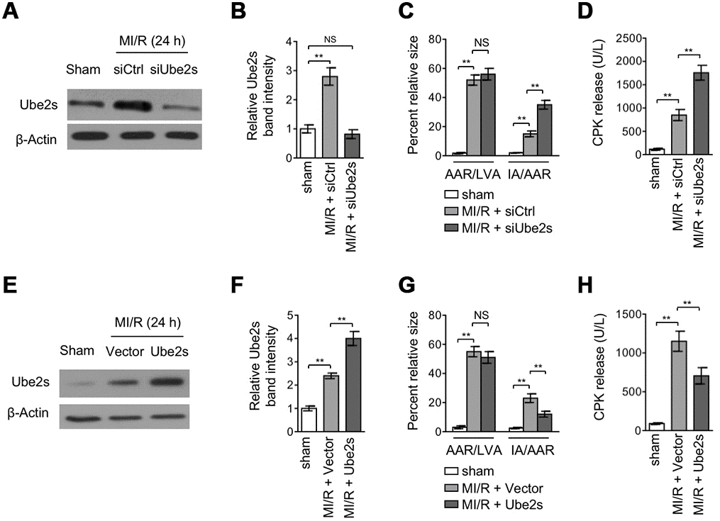 The upregulation of Ube2s expression after MI/R injury implies that it may play a functional role in this pathological condition. To test this possibility, we performed Ube2s expression knockdown in the mouse heart using the technique of siRNA transfection in vivo [20]. Western blotting analysis revealed that the upregulated Ube2s expression in the heart after MI/R injury was completely abrogated by the transfection of siRNA targeting the mouse Ube2s (Figure 2A–2B), indicating a high efficacy of siRNA-mediated knockdown in vivo. Next, to reflect the effect of Ube2s knockdown on MI/R injury, the mouse heart slices were stained with Evans blue and 2,3,5-triphenyltetrazolium chloride (TTC) to delineate the area at risk (AAR) and infarct area (IA), respectively [21]. The quantification analysis showed that although the ratio of AAR to left ventricular area (LVA) in siUbe2s group had no statistical significance when comparing with that of siCtrl, the ratio of IA to AAR was significantly higher in siUbe2s group (Figure 2C), suggesting that Ube2s expression knockdown increases myocardial infarct size after MI/R injury. Consistently, the detrimental effect of Ube2s knockdown after MI/R injury was reinforced by the observation that the released level of serum creatine phosphokinase (CPK) was prominently higher in mice transfected with siUbe2s (Figure 2D), which indicates an enlarged myocyte injury in the absence of Ube2s after MI/R injury. These data demonstrate that Ube2s depletion in the heart exacerbates MI/R injury.