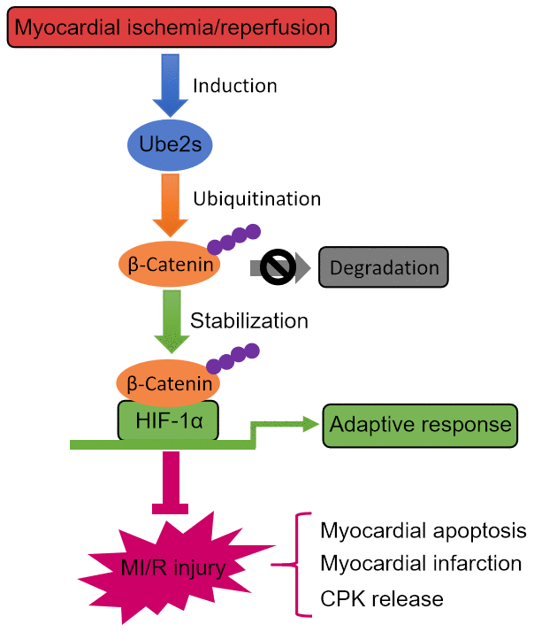 The ubiquitin-conjugating enzyme E2S (Ube2s) is a K11 linkage-specific E2, which catalyzes the elongation of K11-linked polyubiquitin chain on substrates to promote proteasome-mediated degradation [13]. However, recently, Ube2s has been associated with the stabilization of β-Catenin via ubiquitination modification [14]. Additionally, β-Catenin was found to interact with HIF-1 to promote cellular adaptation to hypoxia [15]. Furthermore, β-catenin protects against hepatic I/R injury in mice through augmenting HIF-1 signaling [16]. Given these clues, we hypothesized that Ube2s may play a role in MI/R injury. In this study, we report the protection of Ube2s against MI/R injury in a mouse model, during which the excessive activation of HIF-1α signaling induced by Ube2s-stabilized β-catenin constitutes a critical mechanism.