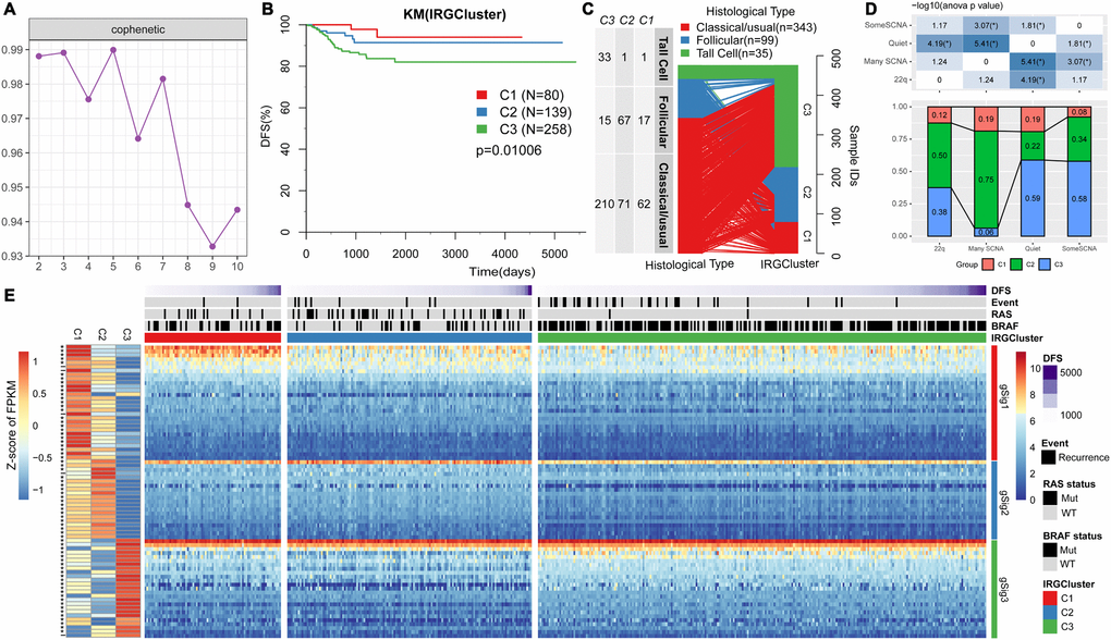 Comprehensive analysis showed that the three molecular subtypes reported by IRGCluster have different molecular characteristics and are prognostic biomarkers of THCA. C3 subtype is associated with poor prognosis. T, N, Stage and Lymph Node Count are key prognostic factors in THCA [34]. As expected, there was a significant association between IRGCluster and the patient's clinical features. Advanced T, N, Lymph Node Count, and Stage samples tended to be distributed in the worst prognostic C3 subtype. The expression distribution of the three subtypes of characteristic gene scores in metastatic, primary tumor and paracancerous samples. The expression level of gSig1 and gSig2 in the paracancerous samples was higher than that in the tumor samples, while the expression of gSig3 in paracancerous samples was significantly lower than that in the tumor sample. These findings were verified in an external independent data set. These three gene scores are important markers for the occurrence and development of thyroid cancer. We compared these three molecular subtypes with the PTC molecular subtypes from TCGA (ERK score, BRAF_RAF score and differentiation score). We found that the ERK score was significantly lower in C2 than that in C1/C3. The BRAF_RAF score and differentiation score were significantly higher in C1/C2 than in C3. Moreover, BRAF_RAF and differentiation scores correlated with poor prognosis.