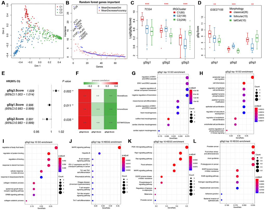 Principal component analysis was used to classify expression of the 74 genes into three subtypes (Figure 2A). The 74 genes were sequenced in importance through a random forest, we can see that there is a significant jump in the mean decrease gini index of top10 gene (Figure 2B), thus top10 genes were selected for subsequent analysis. In the top 10 important gene subsets, 3 gSig1genes, 4 gSig2 genes and 3 gSig3 genes were selected, and the gSig score for each group was presented as the average expression (Figure 2C). In terms of distribution among the subtypes, gSig1 was highly expressed in C1, gSig2 was highly expressed in C2, and gSig3 was highly expressed in C3 (Figure 2C). A set of external datasets GSE27155 were employed to verify this phenomenon (Figure 2D). Notably, we observed significant prognostic differences in DFS among the gSig scores in each sample (Figure 2E). Specifically, gSig3 was found to be a risk factor, while gSig1 and gSig2 were protective factors. The R software package ESTIMATE was used to calculate and compared the immune infiltration score of each sample. The gSig3 score was highly positively correlated with immune infiltration, while the gSig2 score was negatively correlated with immune infiltration (Figure 2F), suggesting that the gSig score can monitor the efficacy of immunotherapy. GO and KEGG enrichment analyses showed that gSig1, gSig2 and gSig3, were enriched in various biological pathways (Figure 2G-I). gSig1 was associated with ERK cascade (Figure 2G, Figure 2J), gSig2 was involved in cell migration and proliferation (Figure 2H, Figure 2K), gSig3 was associated with body fluid and protein regulation (Figure 2I, Figure 2L). The response to steroid hormone was significantly enriched in the gSig3 GO enrichment results (Figure 2I), which is significantly different from the response to steroid hormone seen in the extrathyroidal extension type of THCA in previous studies [23]. These results suggested that these gene sets are involved in different biological pathways which are associated with different clinical outcomes in patients with THCA.