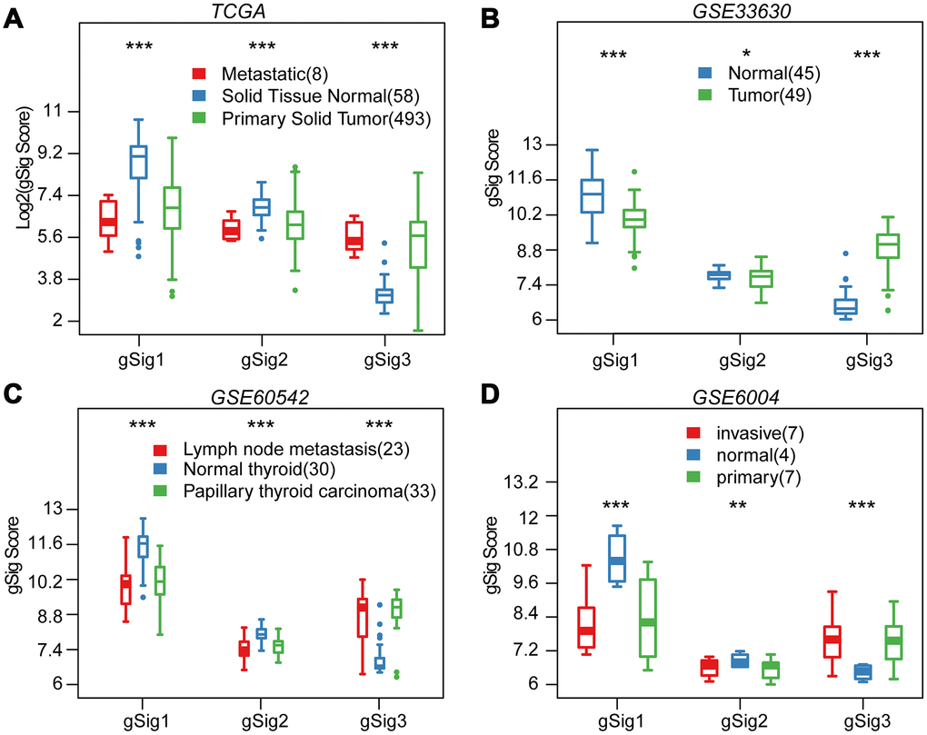 We first evaluated the distribution of T, N, M, Stage, Age, and Lymph Node Counts in the three molecular subtypes (Table 1). Significant differences in T, N, Stage, and Lymph Node Count were observed among the three molecular subtypes (p<0.01). Advanced samples such as T, N, Stage and Lymph Node Count samples were highly distributed in the C3 subtype with the worst prognosis. This indicated that these three molecular subtypes are closely related to the clinical stage. The expression distribution of the three subtypes of characteristic gene scores in metastatic samples, primary samples and paracancerous samples were analyzed, and the three subtype characteristic gene scores showed extremely significant expression differences in different samples types (Figure 3A). The expression in the paracancerous samples in gSig1 and gSig2 was higher than that in the tumor samples, and the paracancerous samples in gSig3 were significantly lower than the tumor samples. A similar phenomenon was observed in the external datasets GSE33630, GSE60542, GSE6004 (Figure 3B–3D). These results indicated that the three subtypes of characteristic gene scores are markers of the THCA development and progression.