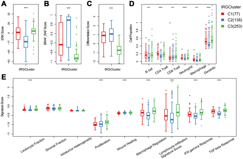 Previous studies have reported thyroid typing based on TCGA. Agrawal N [15] identified three molecular subtypes of thyroid papillary carcinoma; ERK score, BRAF_RAF score and differentiation score. In this study, the distribution of ERK score, BRAF_RAF score and differentiation score in the three immune subtypes was explored (Figure 4A–4C). The ERK score was significantly lower in C2 than that in C1/C3, and the BRAF_RAF and differentiation scores were significantly higher in C1/C2 than in C3. BRAF_RAF and the differentiation scores predicted poor prognosis, which is consistent with the better C1/C2 prognosis than C3. We further analyzed the differences in distribution of six immune cell components (B_cell, CD4_Tcell, CD8_Tcell, Neutrophil, Macrophage and Dendritic) in each subtype. Significant differences were observed in the distribution of the six immune cells among the three molecular subtypes. Notably, B_cell, CD4_Tcell, Neutrophil, Macrophage, and Dendritic were significantly lower in C2 than in C1 and C3, indicating that C2 was mainly enriched in follicular type samples. Although C1 and C3 were similar, CD4 T cell score was higher in C1 than C3, while CD8 T cell and dendritic cell scores were higher in C3 that in C1, suggesting distinct immune responses among the IRGCluster. A previous analysis showed that immune expression signatures [24] were significantly different between C2 and C1/C3 (Figure 4E). However, in C3 subtype with the worst prognosis, the leukocyte fraction, proliferation macrophage regulation, lymphocyte infiltration, IFN gamma response and TGF beta response scores were significantly higher than in C1/C2 subtypes. These results indicated that the three molecular subtypes have different immune microenvironments, which may underlie the differences in prognosis among them.