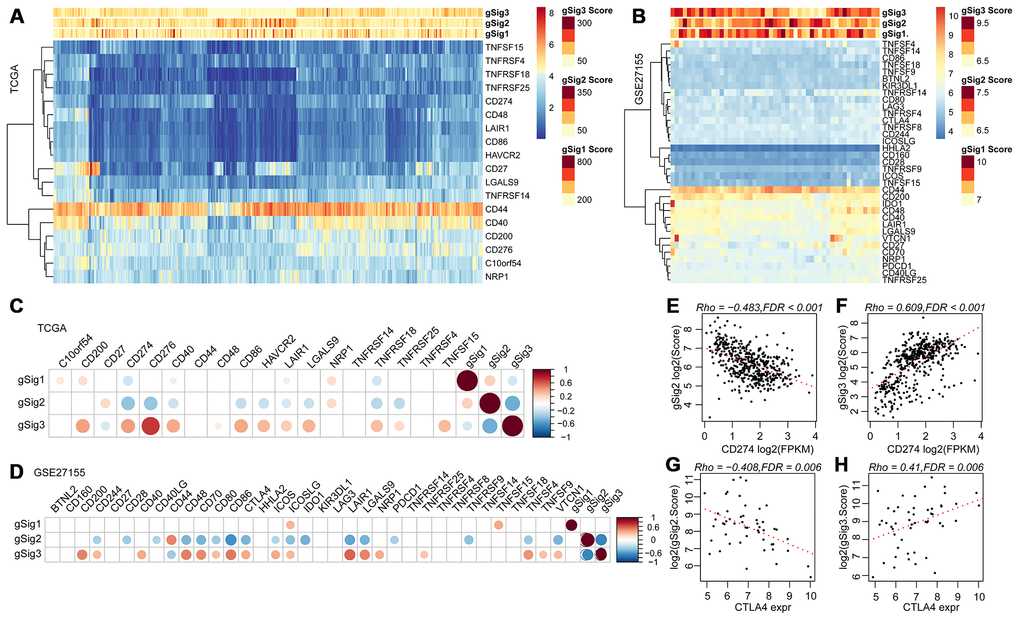 We further analyzed 18 high-level immune checkpoint genes (ICGs) from the past literature to assess the relationship between the expression levels of these 18 ICGs and gSig1, gSig2 and gSig3 in the TCGA data set (Figure 5A). Overall, gSig1 and gSig2 were negatively correlated with the expression of 18 ICGs, while gSig3 was positively correlated with ICGs expression. The same phenomenon was observed in the external independent verification set GSE27155 (Figure 5B), gSig2 was significantly correlated with 11 (61.1%) ICGs, of which 9 (50%) were highly negatively correlated. gSig3 was significantly correlated with 13 (72.2%) ICGs, of which 12 (66.7%) were negatively correlated (Figure 5C), and similar results were also observed on the independent data set GSE27155 (Figure 5D). A recent study showed that CD274 (PD-L1) and CTLA4 are molecular markers of immunological checkpoint inhibitors. In the TCGA dataset, CD274 was highly expressed, the lower the gSig2, while the gSig3 is opposite (Figure 5E, 5F) (where CTLA4 is not detected). A similar phenomenon was observed in the GSE27155 set (Figure 5G, 5H) (wherein CD274 was not detected). The expression of CD274 and CTLA4 can be used to evaluate the benefit of immune checkpoint inhibitor therapy. Here, the samples were divided into benefits and non-benefit groups based on CD274 and CTLA4 expression. The gSig2 score and gSig3 score were used to predict the average AUC > 0.77 in CD274 expression sample from the TCGA data set. For CTLA4 expression in the GSE27155 data set, the average AUC > 0.73 (Supplementary Figure 2A), suggesting that gSig3 score may be a powerful prognostic biomarker and predictor of immune checkpoint inhibitor response. Similarly, the correlation between gSig score and the expression of known markers BRAF was analyzed. Notably, gSig1 and gSig2 showed a significant positive correlation with BRAF while gSig3 was significantly negatively correlated with BRAF (Supplementary Figure 2B). These results indicated that IRGCluster molecular subtypes can be used as immunotherapeutic molecular markers.
