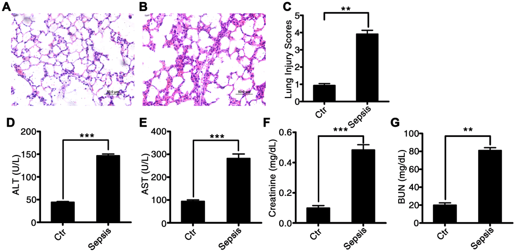 We induced sepsis in rats using CLP surgery. Histological analysis showed that the CLP-induced sepsis resulted in pulmonary injury (Figure 2A–2C). Interstitial edema with massive infiltration of inflammatory cells into the interstitial and alveolar spaces was observed, and pulmonary architecture was found to be severely damaged in rats with CLP-induced sepsis. Additionally, the levels of hepatic-injury markers (ALT and AST activities) were significantly higher in the plasma of rats with CLP-induced sepsis as compared to that in control rats (60.2 ± 5.5 vs 16.3 ± 1.85, P < 0.001, and 100.4 ± 6.4 vs 15.8 ± 2.87, P < 0.001, respectively; Figure 2D and 2E). Creatinine and blood urea nitrogen (BUN) concentrations, i.e., markers of renal injury, were also higher in the rats with CLP-induced sepsis than that in the control rats (0.48 ± 0.17 vs 0.11 ± 0.084, P < 0.001, and 81.3 ± 2.46 vs 19.8 ± 3.12, P < 0.001, respectively; Figure 2F and 2G). These data suggested that CLP-induced sepsis causes severe tissue injury, particularly in the lungs.