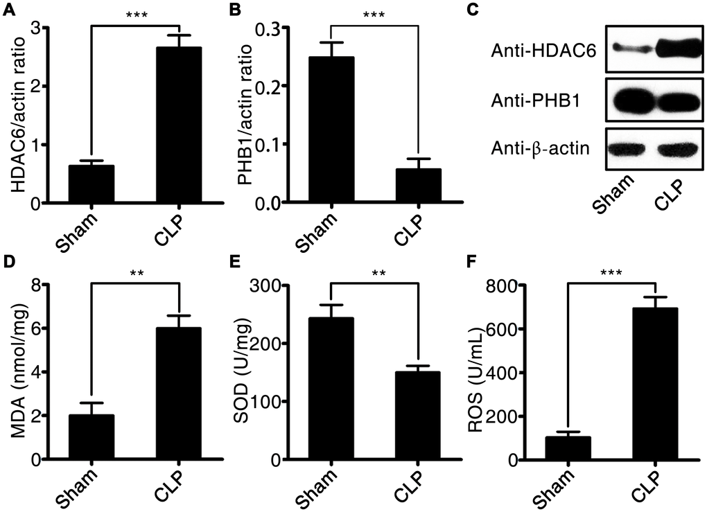 To further understand the effects of HDAC6 during sepsis development, we created a rat model of CLP-induced sepsis. The CLP-induced sepsis in rats was associated with severe pulmonary, hepatic, and renal injury. We also observed that HDAC6 expression was higher while PHB1 expression was lower in the rats with CLP-induced sepsis compared to that in rats in the control group; this was consistent with the data obtained from human sepsis patients. Further investigation revealed that HDAC inhibited PHB1 expression and subsequently altered the efficiency of the mitochondrial respiratory chain, thereby increasing the production of ROS, resulting in the observed oxidative injury to multiple organ tissues.