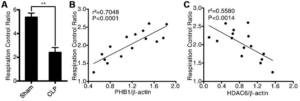To investigate the potential mechanism by which HDAC6 may promote sepsis development, we first determined the mitochondrial respiratory control rate, and then tested whether it correlated with the expression of HDAC6 and/or PHB1. As depicted in Figure 4A, in rats with CLP-induced sepsis, the mitochondrial respiratory control rate was significantly lower compared to that in the control rats (2.56 ± 0.47 vs 5.25 ± 1.57, P < 0.01). Additionally, we analyzed the linear correlation between HDAC6 and PHB1 expression and the mitochondrial respiratory control rate, and found that in rats with CLP-induced sepsis, the expression of HDAC6 protein negatively correlated with the mitochondrial respiratory control rate (R2 = 0.7048, P < 0.0001; Figure 4C) while the expression of PHB1 protein positively correlated with this rate (R2 = 0.5580, P < 0.0014; Figure 4B). Taken together, these results indicated that HDAC6 may promote the development of sepsis via regulation of PHB1-mediated mitochondrial function and homeostasis, in vivo.