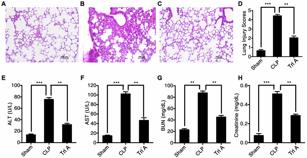 To determine whether selective inhibition of HDAC6 could attenuate CLP-induced sepsis in vivo, we used Tri A (selective HDAC6 inhibitor) to treat the rats with CLP-induced sepsis, and then evaluated possible signs of tissue pathology. Tri A treatment significantly alleviated sepsis-associated lung injury in rats with CLP-induced sepsis in comparison with that in untreated septic rats (Figure 6A–6D). Additionally, plasma ALT activity (Figure 6E), AST activity (Figure 6F), and plasma BUN (Figure 6G) and creatinine levels (Figure 6H) were dramatically lower in the rats with CLP-induced sepsis treated with Tri A relative to that in the untreated septic rats (37.6 ± 1.67 vs 76.5 ± 2.47, P < 0.01; 47.8 ± 2.87 vs 107.2 ± 5.23, P < 0.01; 51.1 ± 2.11 vs 88.7 ± 3.37, P < 0.01; and 0.28 ± 0.02 vs 0.52 ± 0.05, P < 0.01, respectively), indicating that sepsis-induced hepatic and renal injuries were attenuated by HDAC6 inhibition. Taken together, these data implied that HDAC6 may serve as a target in the treatment of sepsis.