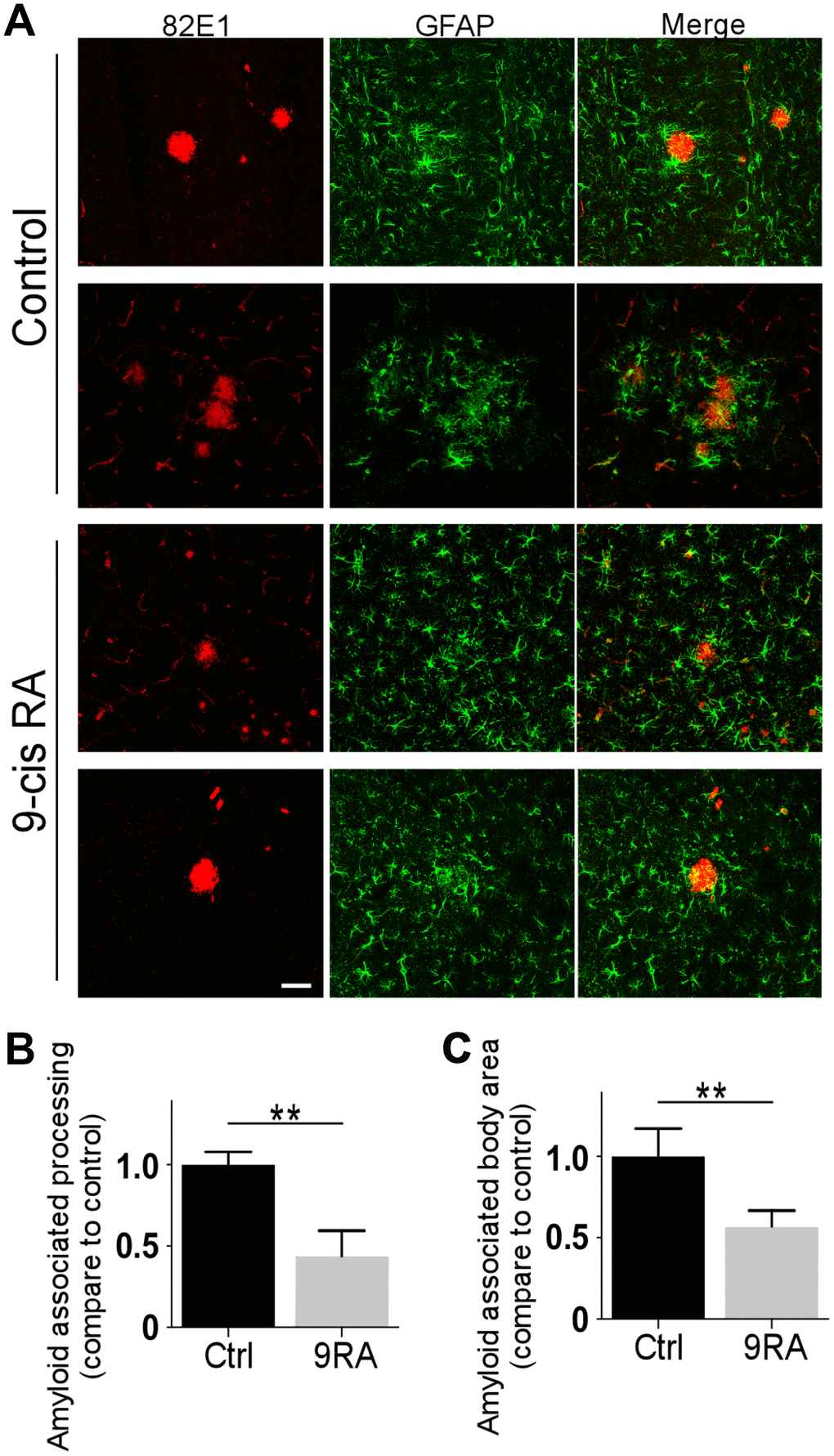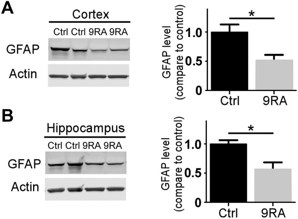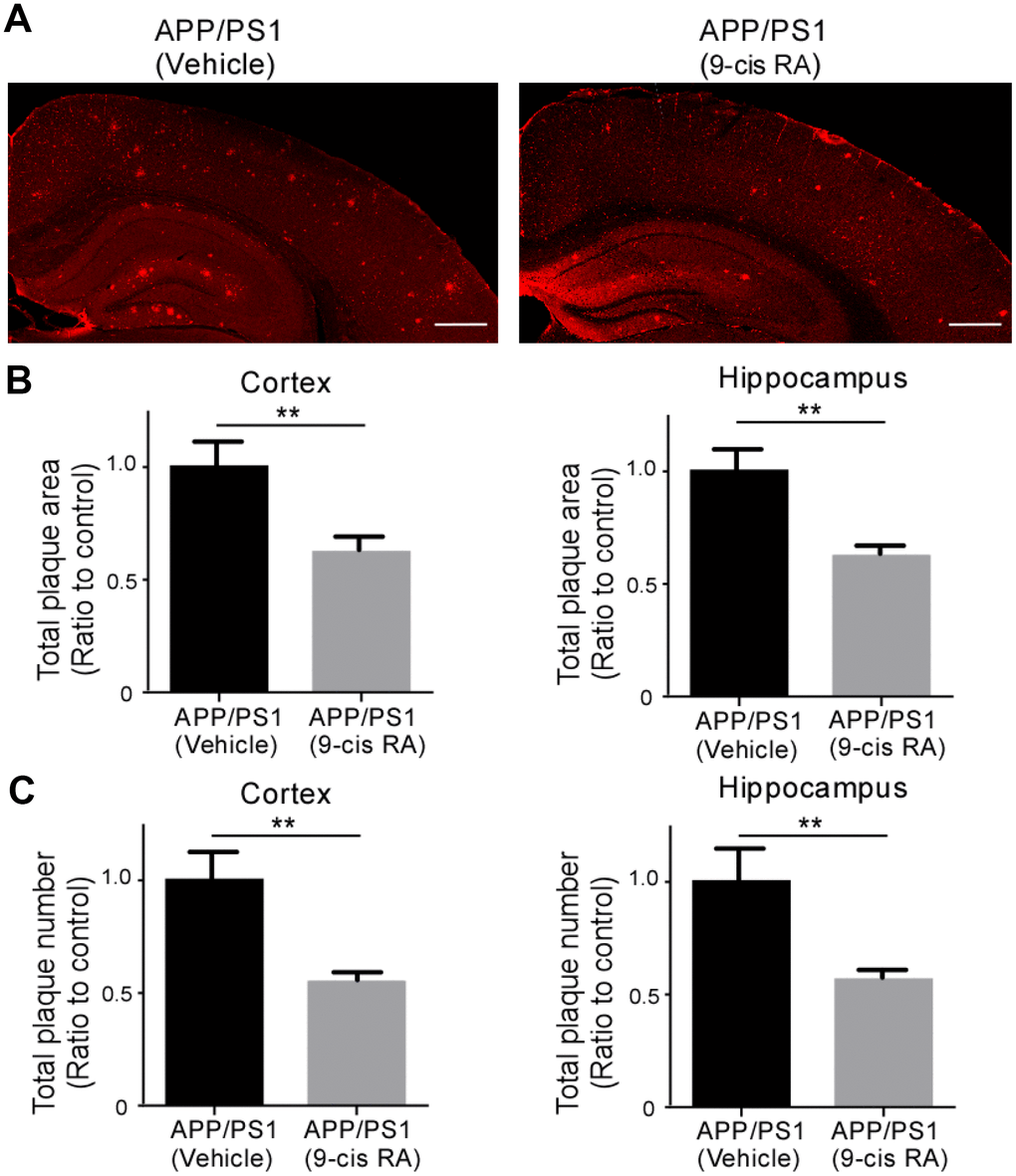 In the present study, we examined the effects of intranasally delivered 9-cis RA on amyloid precursor protein (APP) and presenilin 1 (PS1) double-transgenic mice (APP/PS1). Six-month-old APP/PS1 mice were intranasally treated with 20 μg of 9-cis RA for 4 weeks, which effectively reduced the Αβ burden. More intriguingly, 9-cis RA treatment significantly alleviated astroglial activation and synaptic loss in the brains of APP/PS1 mice.