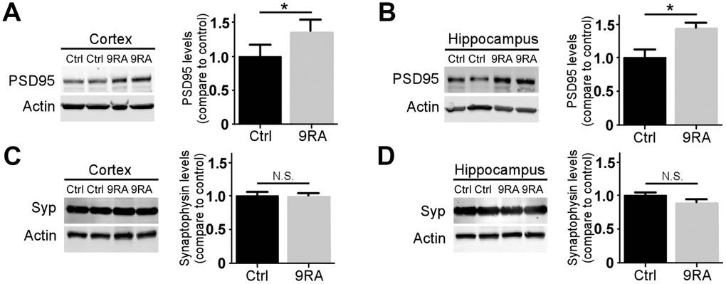 Synaptic loss occurs early during AD progression and is one of the first signs of the neurodegenerative process [19, 20]. To further understand how 9-cis RA affects synaptic changes associated with Aβ, we examined the levels of pre- and postsynaptic markers in the brains of APP/PS1 mice. The level of postsynaptic density 95 (PSD-95) (Figure 4A, 4B), but not that of synaptophysin (Figure 4C, 4D), was significantly increased in the 9-cis RA-treated mice, suggesting that 9-cis RA might ameliorate Aβ-associated synaptic impairment.