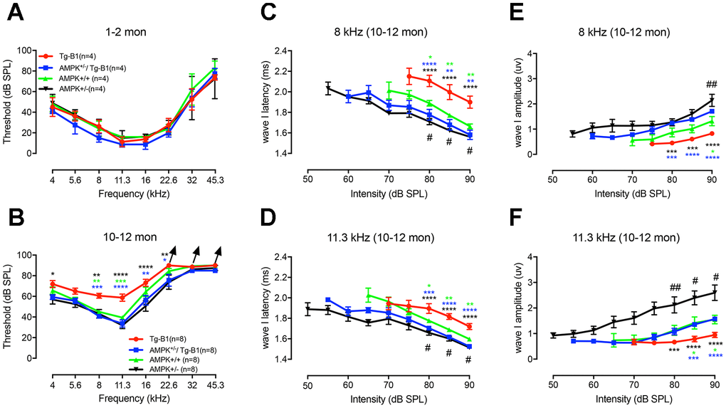 Aging AMPK KO mice maintain better hearing sensitivity compared to Tg-B1 mice and WT littermate controls