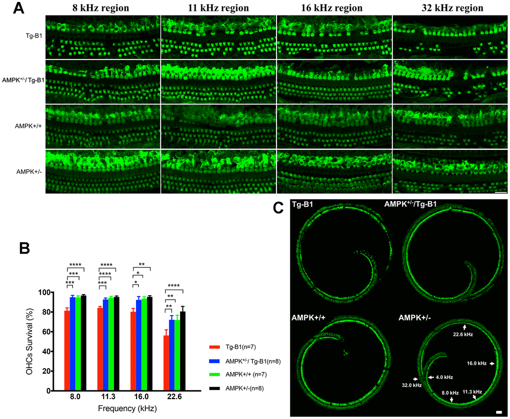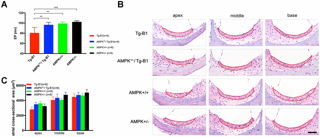 The observed auditory phenotypes in Tg-B1 mice were remarkably rescued by genetic knockouts of AMPK: showing robust ABR wave I, EP and IHC function; as well as SGNs, IHC synapses, and OHC survivals. Accordingly, the downregulation of AMPK protects the integrity of sensory hair cells, ribbon synapses, SGNs, as well as stabilized EP, which jointly contribute to the rescued auditory function.