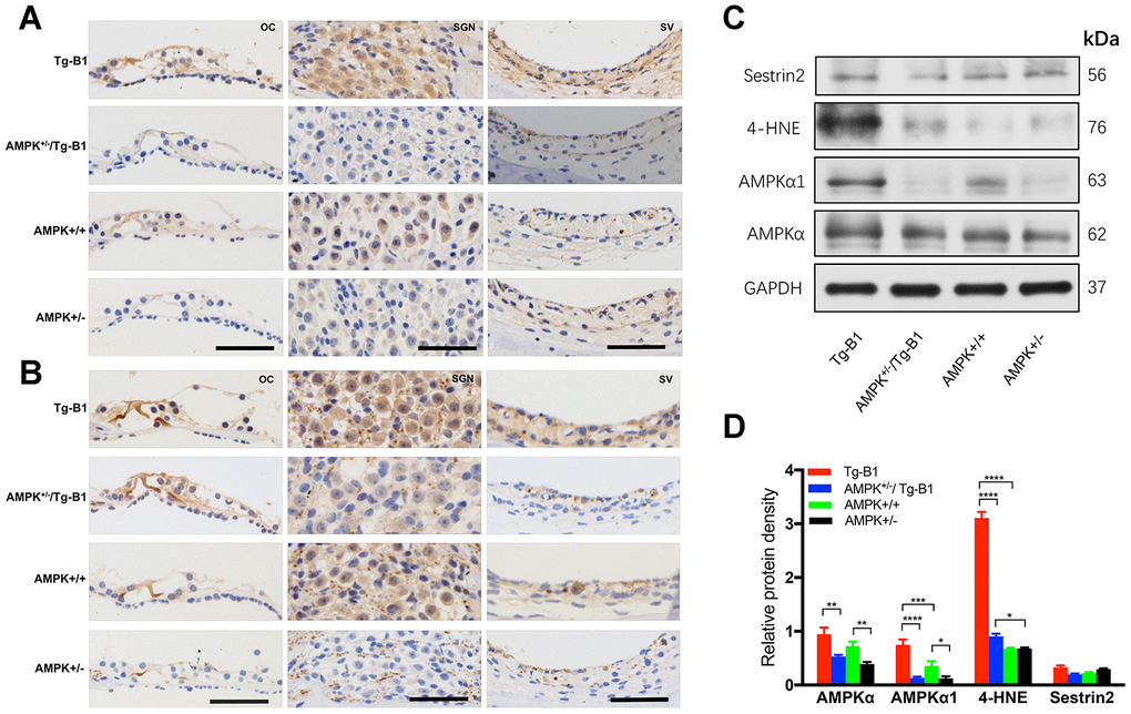 The average level ratio of total AMPKα in the Tg-B1, AMPK+/−/Tg-B1, AMPK+/+ and AMPK+/− mice are 0.9459, 0.5306, 0.7241, 0.3906; The average level ratio of AMPKα1 in the four genotypes are 0.7491, 0.1312, 0.3573, 0.1248, respectively. These results confirmed that genetic knockouts of AMPKα1 in Tg-B1 mice and wild type controls significantly decreased the levels of AMPKα1 (Figure 6D) expressed in the inner ear. Additionally, levels of oxidative stress markers 4-hydroxynonenal (4-HNE) in Tg-B1 mice cochleae were significantly higher than wild type controls and ROS expressed in the cochleae of AMPK+/−/Tg-B1 mice were significantly lower than that of Tg-B1 mice (Figure 6D), indicating that decrease of AMPK resulted in decreased oxidative stress in the cochlea. However, expression of Sestrin2, a key inhibitor of TORC1 activation, remains unchanged (p>0.05, one-way ANOVA followed by Bonferroni post-test).