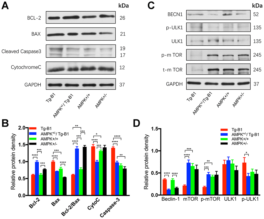 We analyzed the expression of Bax, Bcl-2, Cytochrome C and cleaved caspase-3 proteins in auditory sensory cells (Figure 7A and 7B), and observed in the AMPK+/−/Tg-B1 group, the level of Bax protein decreased by 28% relative to Tg-B1 group (p<0.0001). Expression of Bax (the pro-apoptotic Bcl-2 protein) is upregulated in an AMPK-dependent manner in Tg-B1 group, indicating Bax expression plays a crucial role in AMPK-mediated apoptosis as shown by het-knockouts of AMPKα1. Quantitative analysis of Bcl-2/Bax ratio (anti/pro-apoptotic) show significant differences in the four genotype groups (F(3,8)=312.3, p<0.0001, one-way ANOVA followed by Bonferroni post-test, Figure 7B). Downregulation of AMPK promoted a significant increase in the Bcl-2/Bax protein ratio, implying less pro-apoptotic signaling and more auditory cell survival in the cochlea of AMPK KO mice, matched perfectly with the morphological results of OHCs and SGNs (Figure 2B and 3C). Thereby, het-knockouts of AMPKα1 in Tg-B1 mice could block the AMPK-mediated apoptotic pathway and ultimately reduce the expression of cleaved caspase-3 (Figure 7B), in line with the results of the Bcl-2/Bax ratio. However, KO mice showed the similar level of cleaved-caspase-3 as compared to WT controls (p=0.1572, one-way ANOVA followed by Bonferroni post-test), seemed incompatible with Bcl-2/Bax ratio, indicating there may be other factors at play. Regarding caspase-3, we point out that this is cleaved caspase-3, the active form of this caspase, and that total levels of caspase-3 was found unchanged in the previous instances [12, 14].