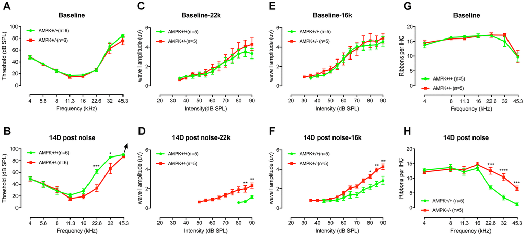 Two-month-old healthy age-and-gender-matched C57BL/6J and AMPK+/- mice littermates were selected in the study. Acoustic overexposure was conducted in a double-walled soundproof chamber. Unrestricted mice were placed in pairs in a wire cage on a heating pad (Harvard Apparatus, 55-7020). A free-field speaker was positioned 10cm away from the ears, with a broadband frequency noise ranging from 8-16 kHz for 2 hours at 106 dB SPL to induce permanent threshold shifts (PTS). ABRs were recorded at day0 (baseline), day1, day7, and day14 post noise exposure. ABR wave I of baseline and 14 days post noise were compared for amplitudes and latencies.