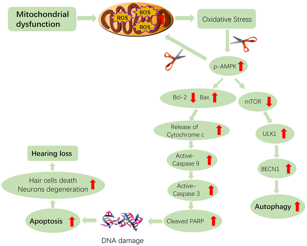 Bcl-2(B-cell lymphoma 2) family members play a crucial role in modulating apoptosis, either to inhibit or to trigger cell death through the intrinsic pathway of apoptosis [50]. It has been reported that AMPK can upregulate pro-apoptotic proteins of Bcl-2 family such as Bim (Bcl-2 interacting mediator of cell death) and Bax (Bcl2-associated X protein) [51–53], which translocate to the mitochondria, then induce Cytochrome C release into the cytosol and permeabilization of the outer mitochondrial membrane (OMM), followed by downstream caspases activation and subsequently trigger cell death, along with biochemical and morphological changes of apoptosis or necrosis, which is decided by cellular ATP level and redox changes interfering with caspase activity [50]. The released pro-apoptotic factors trigger the formation of the apoptosome, caspase-9 proteolysis and activation of caspase-3 which cleaves many protein substrates, ultimately leading to cell death [31]. Apoptosis-dependent cell death pathway is biochemically characterized by protein cleavage, apoptotic chromatin condensation, protein cross-linking, DNA fragmentation, phagocytosis and cell death [50, 54, 55]. Accordingly, that may be the process of apoptosis occurring in auditory cells (Figure 9).