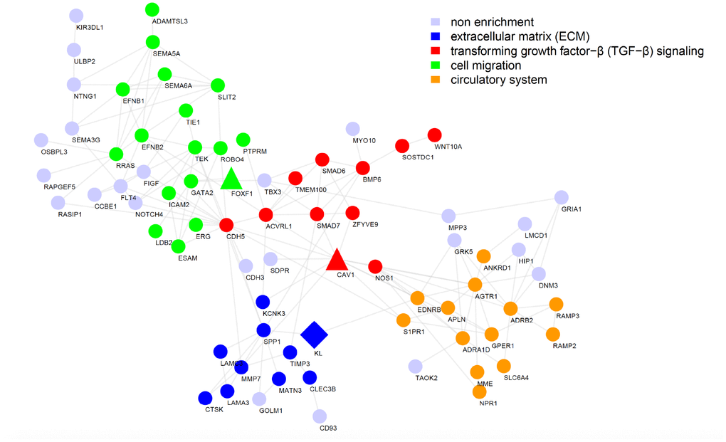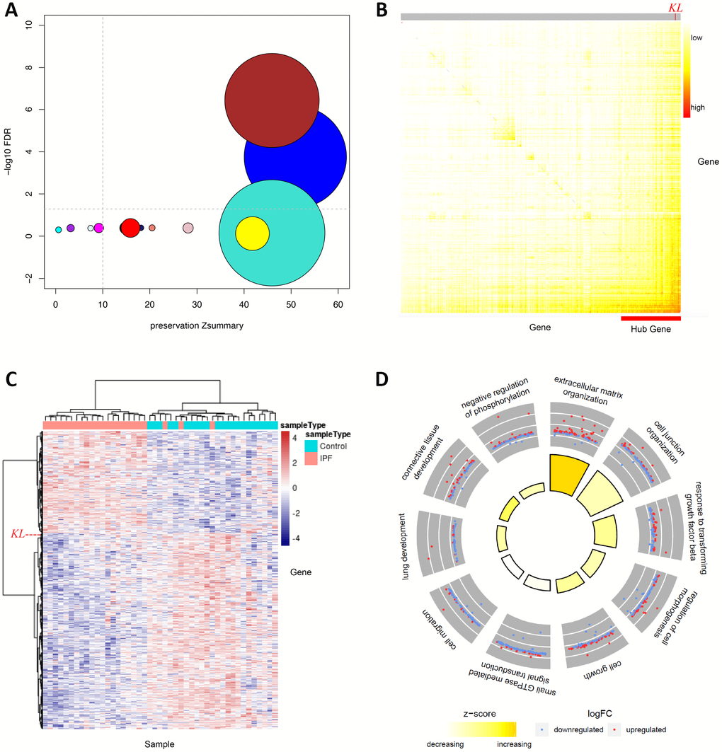 Therefore, with the rationale that co-expressed genes have a tendency to be functional related, we carried out Weighted Gene Co-expression network analysis (WGCNA) to elucidate the functional role of KL on a public RNA-Seq dataset comprising the largest sample size of IPF patients to our knowledge [20]. We reduced the complex and polygenic gene architecture underlying the predisposition to IPF into two functional disease-associated gene modules, in one of which KL plays a pivotal role through interacting with genes related to cell migration, TGF-β signaling, and ECM.