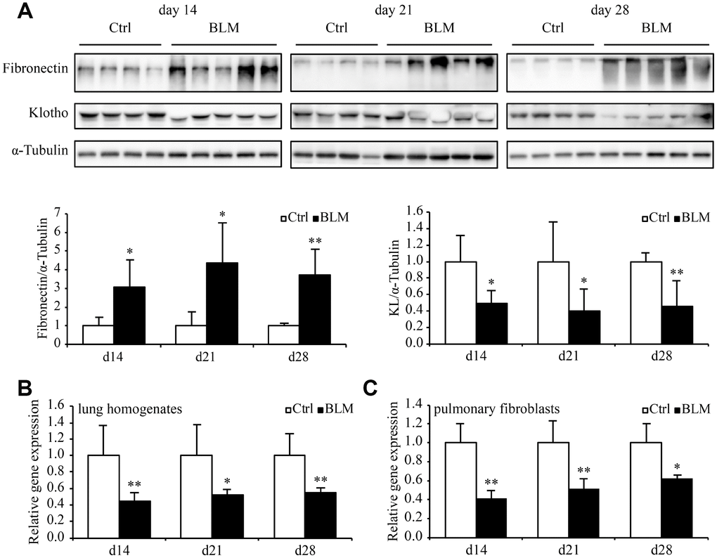 We assessed Kl expression in mouse lungs and pulmonary fibroblasts during bleomycin-induced pulmonary fibrosis. Eight-week-old wild-type C57BL/6 mice were intratracheally administered a single dose of bleomycin. The body weights (Supplementary Figure 1A), both hematoxylin and eosin (H&E) and Masson-trichrome staining of lung tissues (Supplementary Figure 1B), and immunofluorescence staining of collagen I, fibronectin, and α-smooth muscle actin (α-SMA) in the lungs (Supplementary Figure 1C) all confirmed that bleomycin caused severe pulmonary fibrosis. We evaluated the progress of lung fibrosis 14, 21, and 28 days after bleomycin administration. Both the protein and mRNA levels of Kl decreased in every timepoint we examined (Figure 3A and 3B). Likewise, diminished Kl mRNA levels were observed in the primary pulmonary fibroblasts from mice 14, 21, and 28 days after exposure to bleomycin. Therefore, Kl is downregulated in both total lung lysates and isolated pulmonary fibroblasts in the murine pulmonary fibrosis model induced by bleomycin.