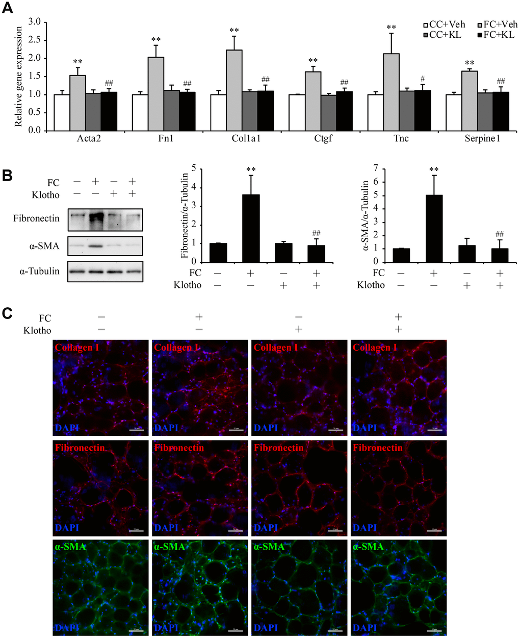 Western blotting was performed as previously described [51]. Individual immunoblots were probed with rabbit anti-α-KL pAb (ABclonal, Wuhan, Hubei, China) diluted 1:1000, mouse anti-α-SMA mAb (Sigma Aldrich) diluted 1:2000; rabbit anti-Fibronectin pAb (Abcam, New Territories, HK, China) diluted 1:1000, goat anti-FOXF1 pAb (R&D Systems) diluted 1:1000, rabbit anti-CDH2 pAb (ABclonal) diluted 1:1000, rabbit anti-CDH11 pAb (ABclonal) diluted 1:1000, rabbit anti-CAV1 (Proteintech, Wuhan, Hubei, China) diluted 1:2000, rabbit anti-JNK pAb (Cell Signaling Technology, Danvers, MA, USA) diluted 1:1000, rabbit anti-p-JNK mAb (Cell Signaling Technology) diluted 1:1000, rabbit anti-ERK1/2 mAb (Cell Signaling Technology) diluted 1:1000, rabbit anti-p-ERK1/2 mAb (Cell Signaling Technology) diluted 1:1000, mouse anti-α-Tubulin mAb (Sigma Aldrich) diluted 1:4000 in 2.5% (wt/vol.) non-fat dried milk in Tris-buffered saline with Tween-20 (TBST) buffer.
