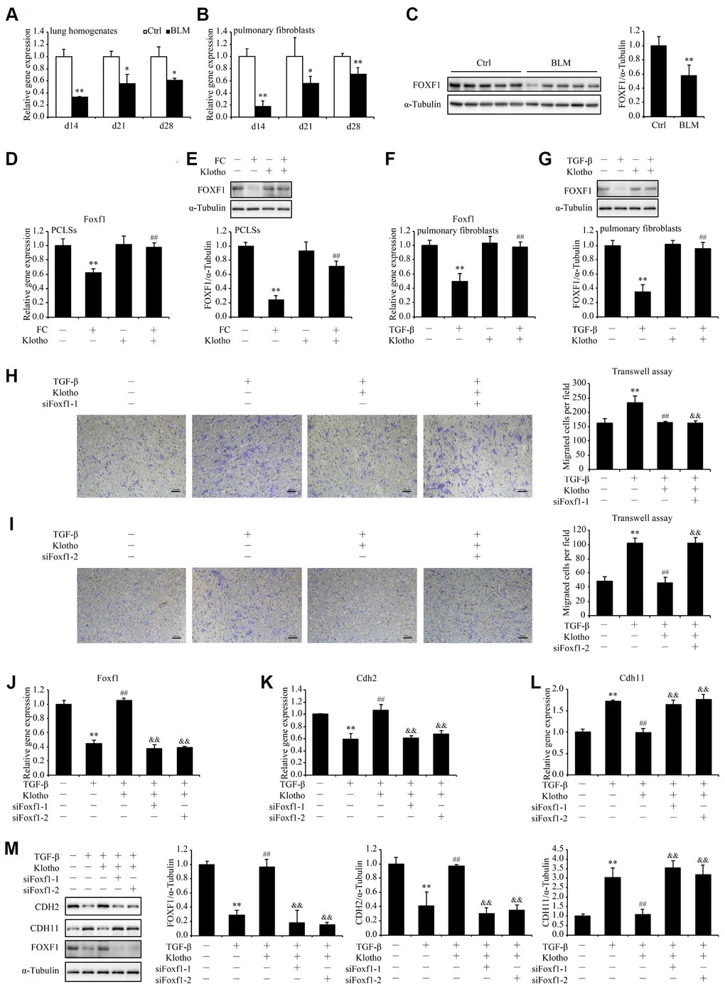 Inspired by SRINGDB-based KL-centric network (Figure 2), we validated the role of Foxf1 in cell migration. We observed significant decreases in the mRNA levels of Foxf1 in both lung lysates and primary pulmonary fibroblasts from mice 14, 21, and 28 days after exposure to bleomycin (Figure 6A and 6B). The decreased protein levels of Foxf1 were also confirmed by western blot (Figure 6C). Since Foxf1 has been reported to inhibit pulmonary fibrosis by preventing CDH2 to CDH11 cadherin switch in myofibroblasts during pulmonary fibrosis [22], we proposed that Kl be very likely to repress the TGF-β-induced migration of pulmonary fibroblasts via enhancing the expression of Foxf1. As hypothesized, rKL supplementation restored Foxf1 mRNA and protein levels in both PCLSs treated with FC (Figure 6D and 6E) and pulmonary fibroblasts incubated with TGF-β (Figure 6F and 6G). Next, endogenous Foxf1 was silenced in pulmonary fibroblasts by siRNAs. The protective effect of rKL on pulmonary fibroblasts migration against TGF-β was abolished by Foxf1 deletion (Figure 6H and 6I). Meanwhile, the expression of Cdh2 and Cdh11, the reported targets regulated by Foxf1 in pulmonary fibroblasts [22], also changed correspondingly (Figure 6J–6M), suggesting that the genes regulated by Foxf1 could constitute an important mechanism by which Kl exerts its effect.