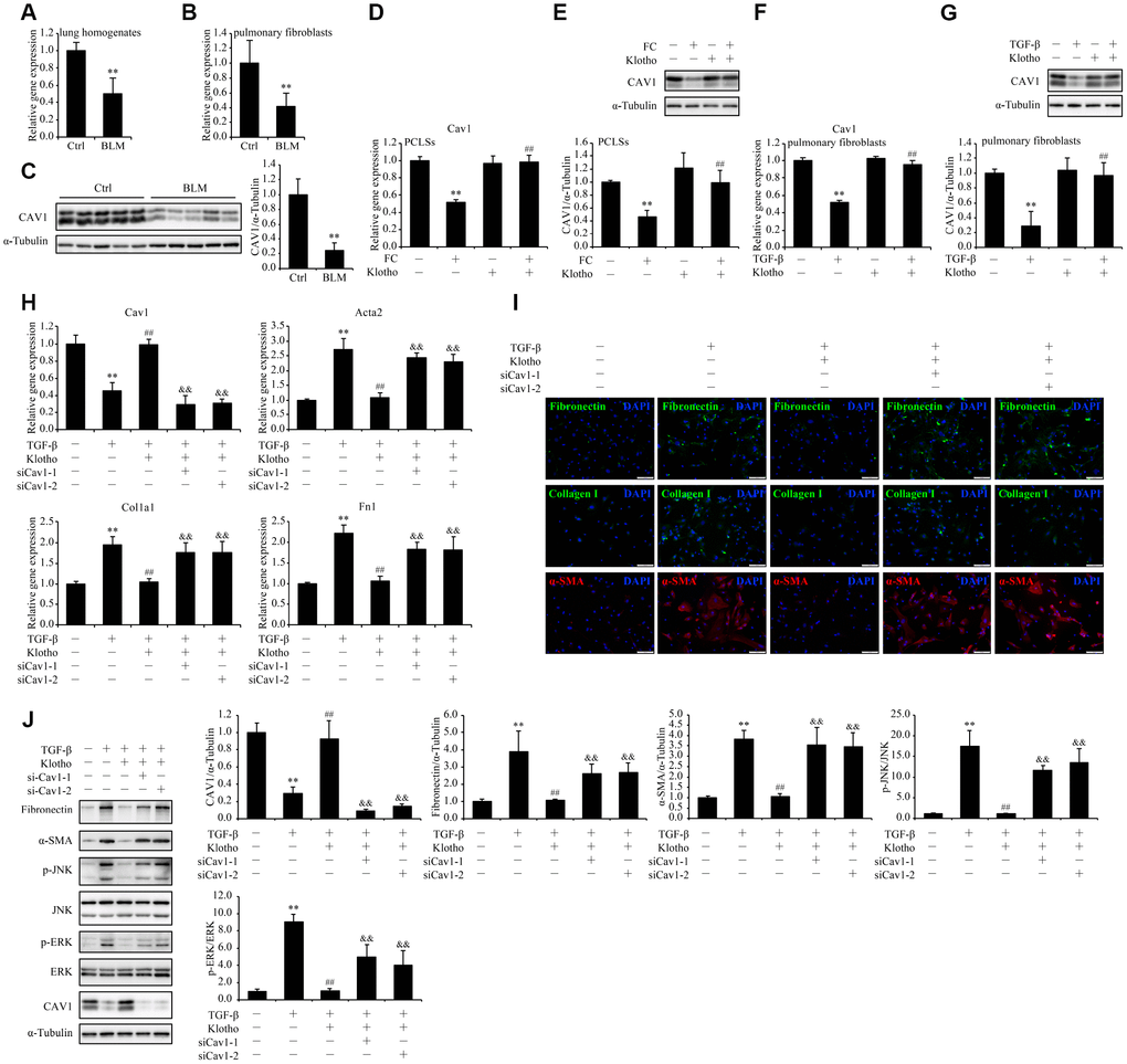 Likewise, the STRINGDB network drew our attention to CAV1 in search of the mechanism underlying the inhibitory effect of KL on fibroblasts activation and ECM production in pulmonary fibroblasts. Encoding Caveolin-1 which is a principal component of caveolae, Cav1 is capable of suppressing major profibrotic signaling pathways and antagonizing potentially profibrotic physiological events [23]. In accordance with past observations [24], we confirmed the downregulation of both Cav1 mRNA and protein levels in total lung lysates as well as isolated pulmonary fibroblasts from bleomycin treated mice (Figure 7A–7C). Given the pivotal role of Cav1 in fibroblasts activation and ECM regulation through ERK and JNK pathways [25], we postulated that Kl suppresses the TGF-β-induced fibroblasts activation and ECM production by restoring the expression of Cav1. As expected, both the mRNA and protein levels of Cav1 were significantly reduced by FC and TGF-β in PCLSs and pulmonary fibroblasts, respectively, while rKL supplementation restored the expression of Cav1 almost to the same levels of those in controls (Figure 7D–7G). Subsequently, we found that the amelioration of TGF-β-induced pulmonary fibroblasts activation and ECM production by rKL was partly suspended after Cav1 had been depleted by siRNAs, with induction of both ERK and JNK phosphorylation at the same time (Figure 7H–7J). Taken together, these findings indicated that Cav1 could mediate the inhibitory effect of Kl on TGF-β-induced pulmonary fibroblasts activation and ECM production.