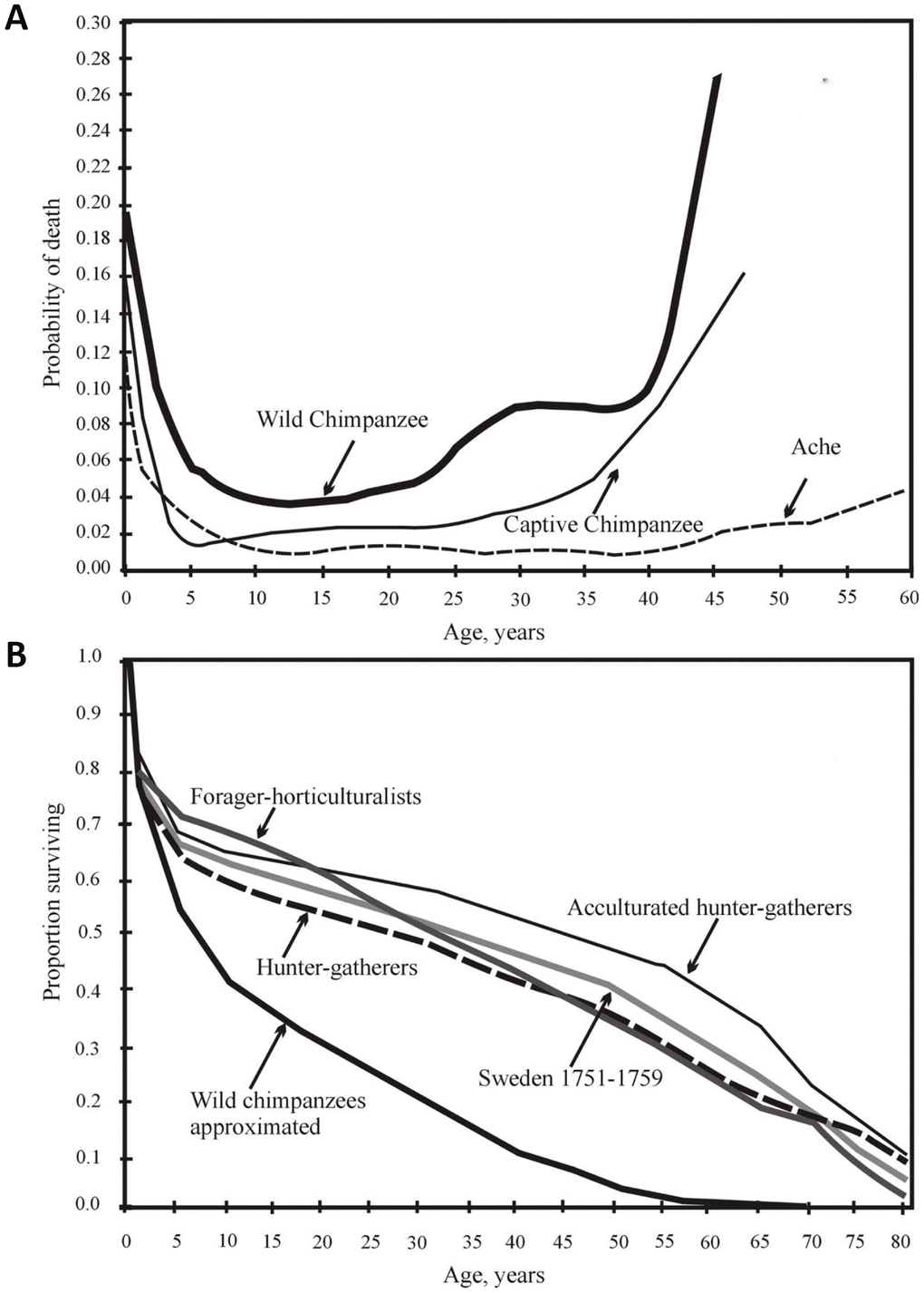 The mortality rates vary among different human populations and between different time periods, especially regarding the risk of sudden death. However, these differences are small from a comparative cross-species perspective. The mortality profile similarity among different preindustrial populations living in different conditions is evident (Figure 1B).