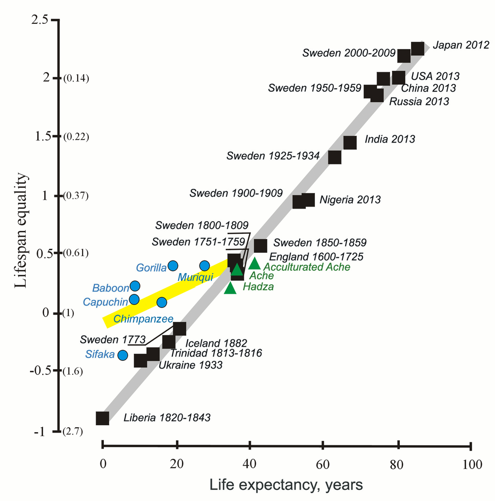 CVLS estimates based on the Jones et al. [33] data from people >10 years old were 16.2% ± 0.1% for the Japanese females, 37.1% ± 0.3% for the Swedish females, and 54.5% ± 0.3% for the Ache Indians. For comparison, CVLS was 59.2% ± 0.2% in >7-year-old chimpanzees [puberty age] and 53.9% ± 0.1% in baboon females in 4 years old [35]. At the same time, the LS95 was 24 years for the baboon females, 49 years for the chimpanzee females, 81 years for the Ache Indians, 89 years for the Swedish females and 102 years for the Japanese females [33]. It is important that Ache hunter-gatherers have, as a rule, minimal (near zero) dependence on modern medicine and do not use any commercial products in their diets [36].