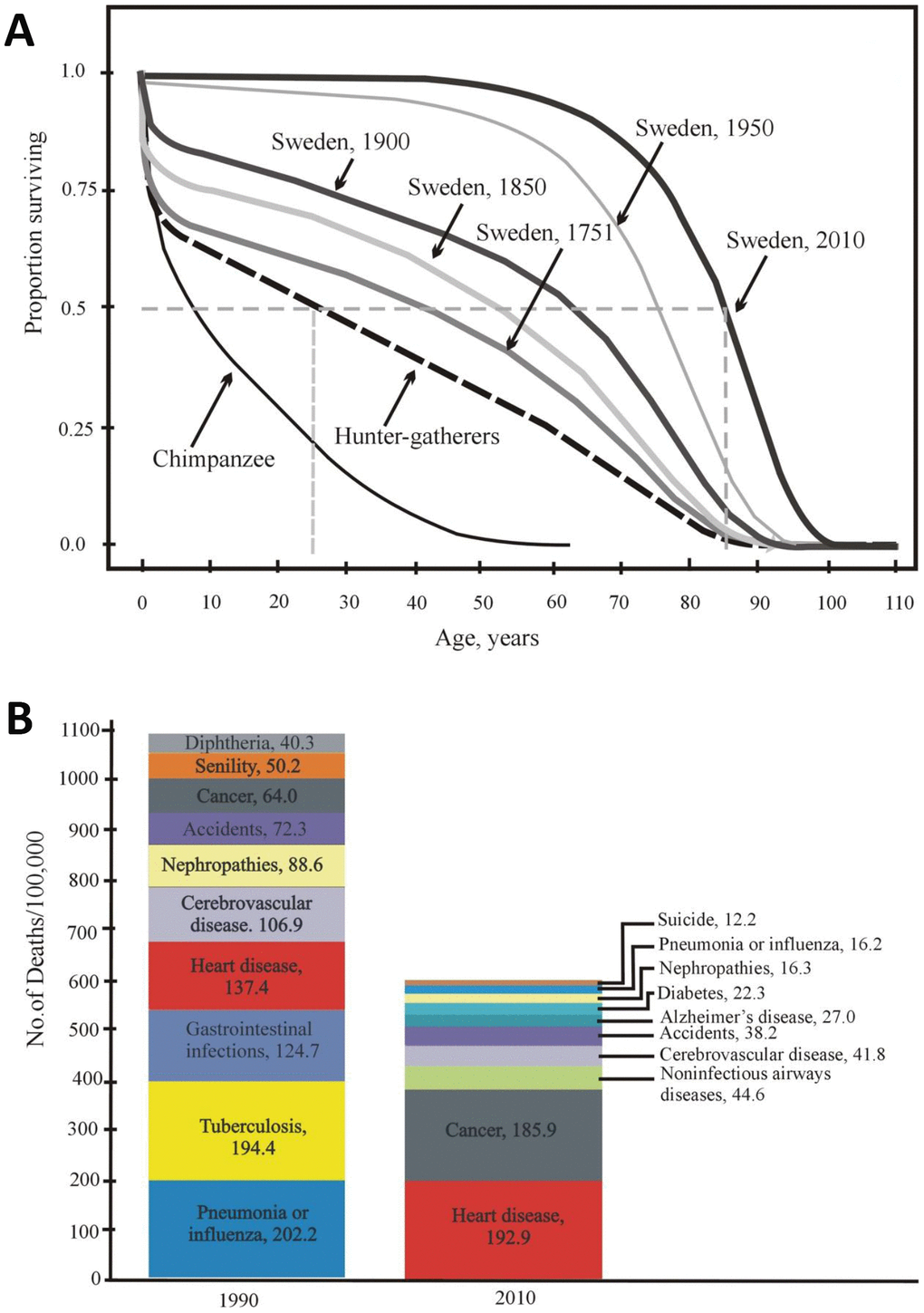 The main part of the pronounced decline in mortality occurred in developed countries from 1900 to 2010 (approximately 4 human generations). Figure 3B shows the structure of mortality in the United States and its change over the aforementioned period from 1900 to 2010. Both earlier and now, diseases of the cardiovascular system contribute to the structure of mortality, taking first place in the number of deaths caused (32.2% in 2010 vs 12.5% in 1900) [52]. In addition, the role of neurodegenerative diseases deserves special attention. These pathologies are important, although they do not have an equally strong influence on the structure of mortality. For example, Alzheimer’s disease takes now sixth place on the list, i.e. 4.5% in 2010. However, neurodegenerative diseases have a very negative effect on the quality of life, socialization and self-sustainment ability of a human being. In fact, they greatly reduce the health span.