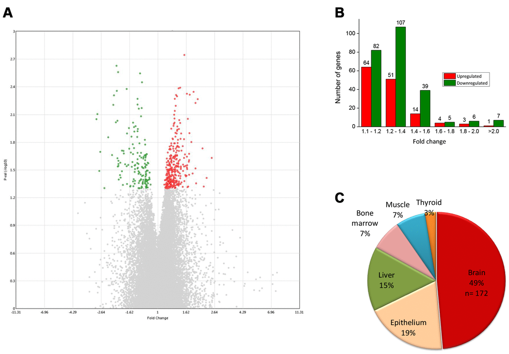 Figure 1B shows the distribution of fold changes of the DEGs. Most of the DEGs (80%) showed fold change <1.4, probably because we did not add any supplement other than verbenalin in the treated cells. For the GO analysis, we have included all the genes with fold change >1.1 (and, p<0.05) to explore the molecular changes which might be small in magnitude but are consistent. Tissue expression analysis by the ‘functional annotation’ tool of DAVID (Database for Annotation, Visualization and Integrated Discovery) software revealed that 49% of DEGs were brain-specific (Figure 1C). Further analysis of brain-specific DEGs showed that 34% genes were previously reported to be expressed in pons (n= 131), 23% in medulla oblongata (n= 90), 21% in parietal lobe (n= 82), and 20% in subthalamic nucleus (n= 75). Gene family analysis of the DEGs revealed 25 genes were transcription factors (TFs), 11 were protein kinases, and seven were growth factors. Top 20 significantly upregulated and downregulated genes and their related GO have been listed in Supplementary Tables 1 and 2, respectively.