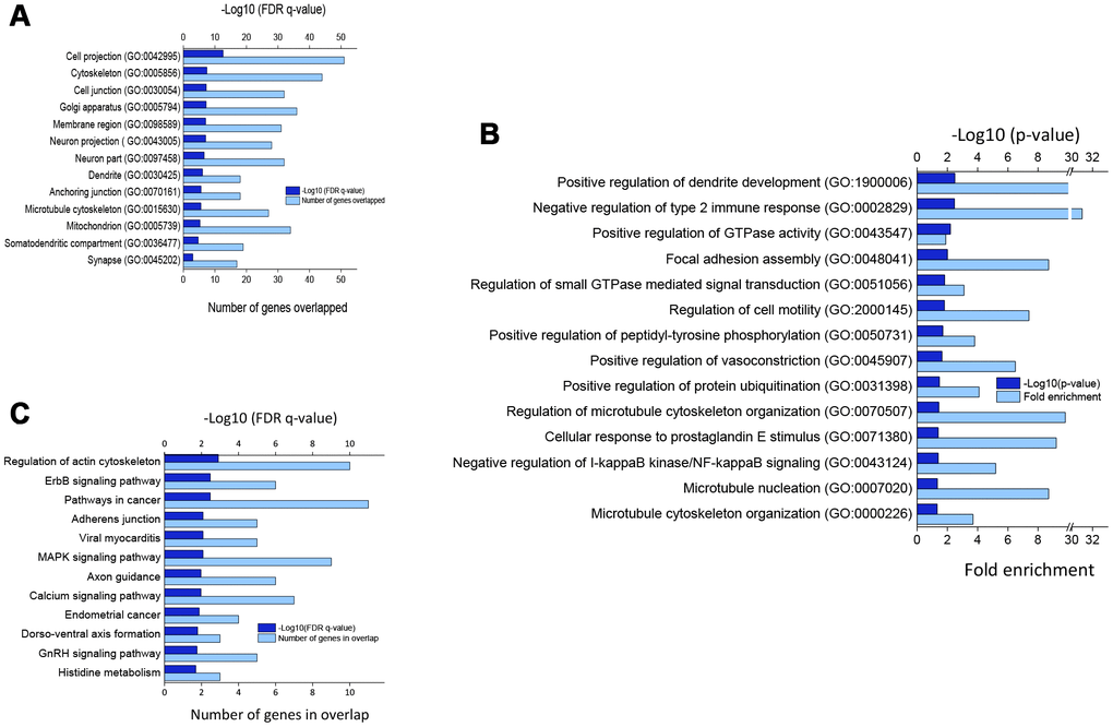 Figure 2 shows significantly enriched cellular components (Figure 2A) and biological processes (Figure 2B) by DEGs in verbenalin-treated hAECs according to false discovery rate (FDR) q-value and p-value, respectively. Significantly enriched top cellular components include, but not limited to, cell projection (GO: 0042995), cytoskeleton (GO: 0005856), cell junction (GO: 0030054), neuron part (GO: 0097458), dendrite (GO: 0030425), and synapse (GO: 0045202). Significantly enriched top biological processes are positive regulation of dendrite development (GO: 1900006), negative regulation of type 2 immune response (GO: 0002829), guanosine triphosphatase (GTPase) activity (GO: 0043547), vasoconstriction (GO: 0045907), protein ubiquitination (GO: 0031398), regulation of GTPase mediated signal transduction (GO: 0051056), cell motility (GO: 20000145), and microtubule cytoskeleton organization (GO: 0000226).