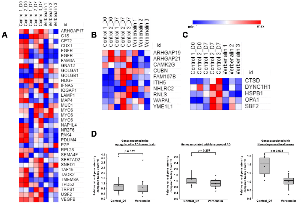 Heat maps for relative expression intensity (Figure 3A, 3B, 3C) shows that several AD-associated genes were upregulated in d7 control hAECs compared to d0 control hAECs. Verbenalin treatment could significantly downregulate those AD-associated gene expressions in hAECs. The expression intensities of the genes associated with AD in both verbenalin-treated and untreated (d7 control) hAECs were compared with d0 control hAECs (Figure 3D). The findings suggest that verbenalin treatment had a significant effect on neurodegenerative disease-associated genes compared to untreated hAECs.