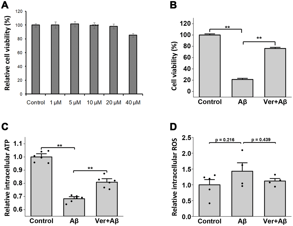 Figure 5C shows the effect of verbenalin treatment on Aβ-induced ATP decline. Exposure to 5 μM of Aβ for 24 h resulted in a significant decrease in ATP production compared to control cells. However, pretreatment with verbenalin for 24 h could rescue the reduction of ATP production in Aβ-treated SH-SY5Y cells (p < 0.01).