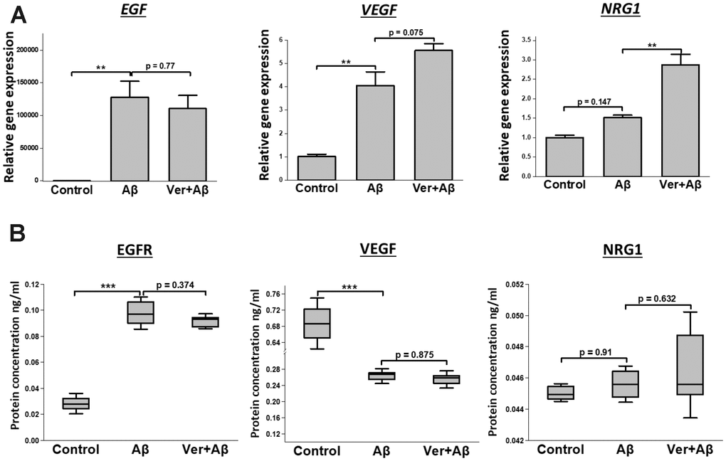 We investigated how verbenalin treatment could modulate the expressions of EGFR, VEGF, and NRG1 in Aβ-induced neurotoxic condition. Figure 6A shows that verbenalin could inhibit Aβ-induced EGFR activation, and upregulated the expressions of VEGF and NRG1. EGFR and NRG1 showed similar protein expression patterns as gene expression (Figure 6B).