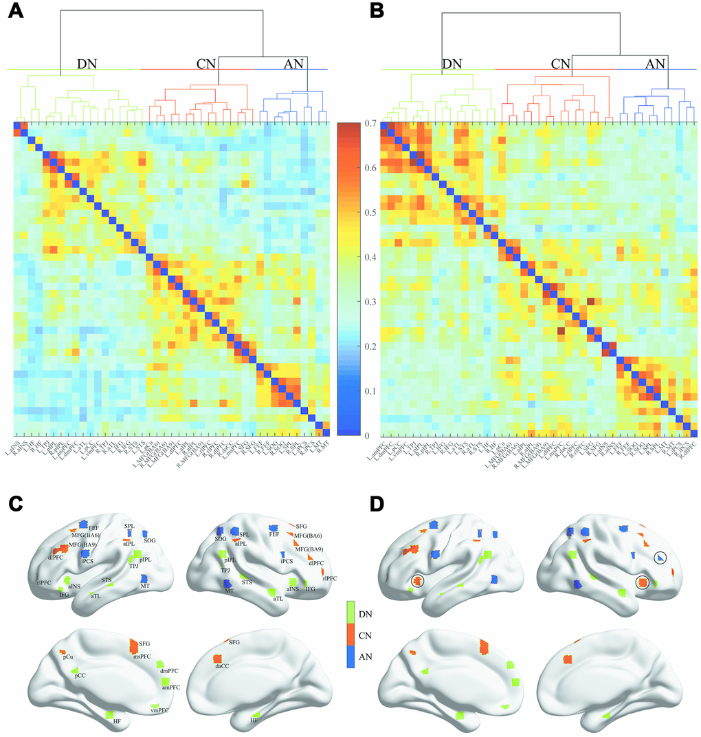 The hierarchical-clustering algorithm might be an optional way of classifying brain networks. It might be inappropriate to classify regions into different networks only according to previous research, neglecting the characteristics of a study’s own samples, such as age and health. For example, middle frontal gyrus (MFG) was defined as one region of DN across three subject groups (young controls, elderly controls and AD patients) [27], whereas MFG was determined to be one of the regions of CN during every condition (i.e., rest state and task state) [17]. A possible approach is to reorganize brain regions by utilizing the hierarchical-clustering algorithm. Meanwhile, it has been demonstrated that the hierarchical clustering method has a high accuracy for the analysis FC patterns [28]. The results obtained by these means were essentially in line with previous studies [17, 18, 29].
