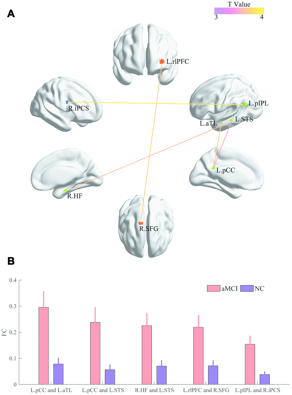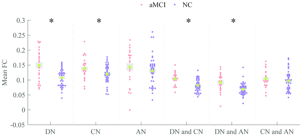 The mean FC strengths of the default and control networks were significantly increased in the aMCI patients and significantly grew between the DN and AN, DN and CN for the patients. Further research suggested that five stronger pairs of FC strength were discovered in the patient group (left posterior cingulated cortex (L.pCC) and left anterior temporal lobe (L.aTL), L.pCC and L.STS, right hippocampal formation (R.HF) and L.STS, left rostrolateral prefrontal cortex (L.rlPFC) and right superior frontal gyrus (R.SFG), left posterior inferior parietal lobule (L.pIPL) and right inferior precentral sulcus (R.iPCS)). Meanwhile, six regions (left anterior medial prefrontal cortex (L.amPFC), L.aTL, R.HF, L.pCC, L.pIPL, L.STS) located in the default network showed significantly higher Dc for the patients, and one of the regions (L.STS) displayed a significantly negative relationship with MMSE.