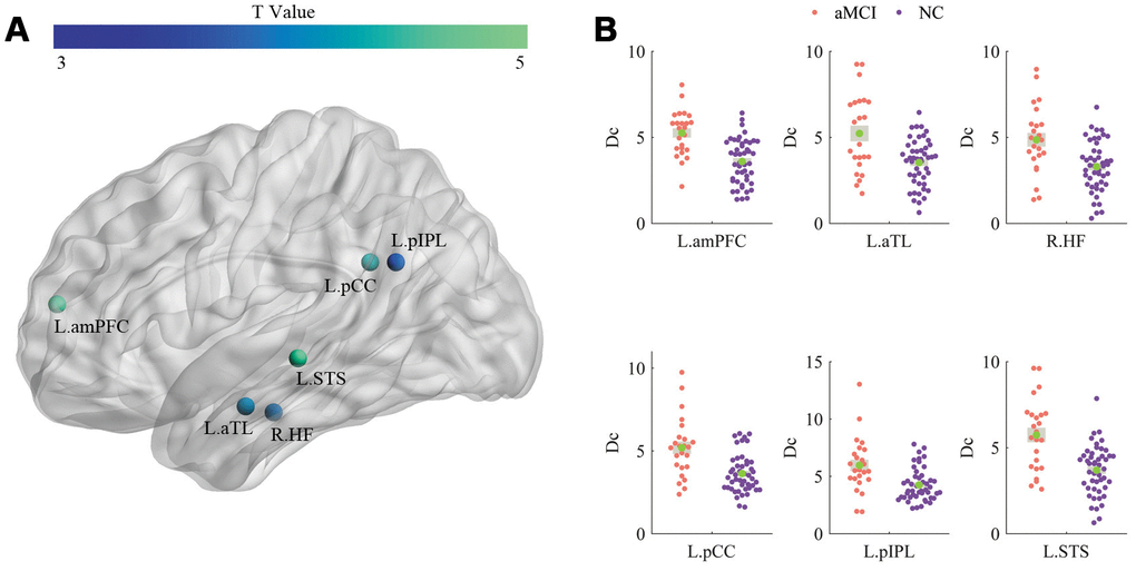 The Dc values of the 6 regions were significantly increased in the patient group, and panels (A) and (B) of Figure 4 illustrate the T values and the significant alterations (Bonferroni corrected) between the two groups, respectively.