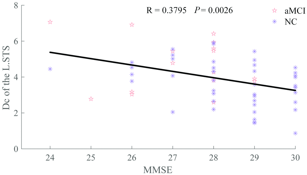 The Dc of the left superior temporal sulcus (STS) was significantly (R = 0.3795, P = 0.0026) correlated with MMSE, as shown in Figure 5. Lower cognitive ability (lower MMSE scores) was significantly associated with a greater increase in the Dc of the left STS. No significant relationship between FC and MMSE was detected.