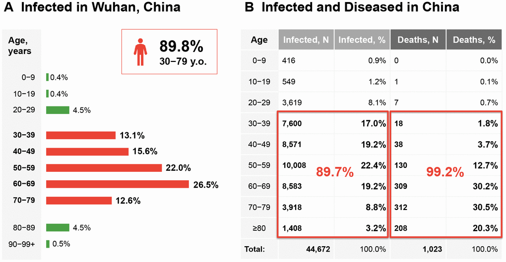 Figure 1. COVID-19 as a gerophilic and gerolavic infection. (A) Distribution of patients diagnosed in the city of Wuhan only through February 11, 2020. (B) Age distribution of the infected and diseased patients in Mainland China through February 11, 2020. The figures are adopted and generated from [12] (http://weekly.chinacdc.cn/en/article/id/e53946e2-c6c4-41e9-9a9b-fea8db1a8f51).