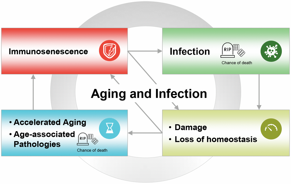 Figure 2. The vicious circle of aging and infection, where age-associated immunosenescence leads to reduced ability to resist infection; infection leads to increased damage, loss of homeostasis, and accelerated aging; which in turn leads to age-related diseases, further accelerating immunosenescence. Infections and other age-related diseases are among the main causes of death in the developed world and developing countries.