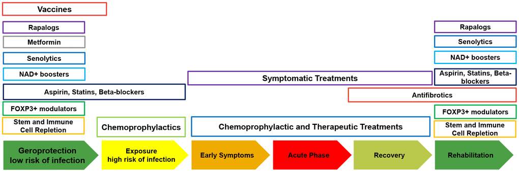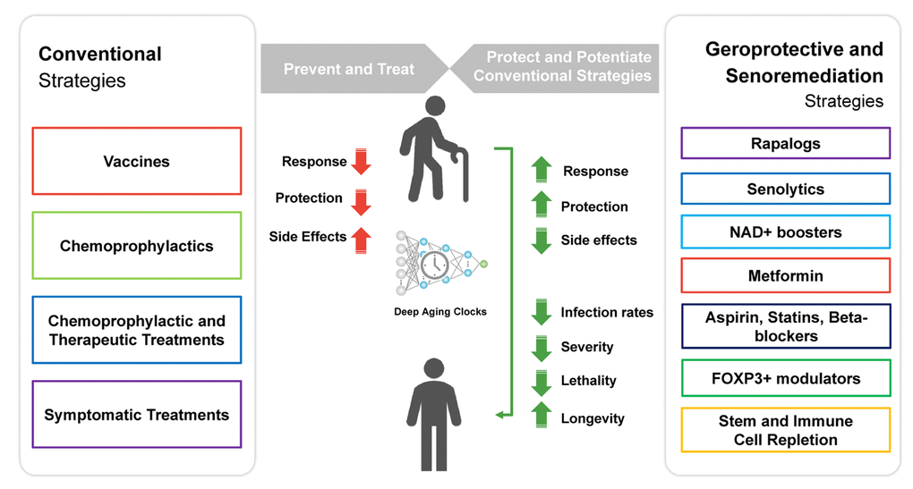 Figure 3. Geroprotective and senoremediative strategies, such as a course of low-dose rapamycin, may potentiate the response to conventional prevention and treatment strategies, prevent infection, reduce disease severity and lethality, and may also increase longevity.