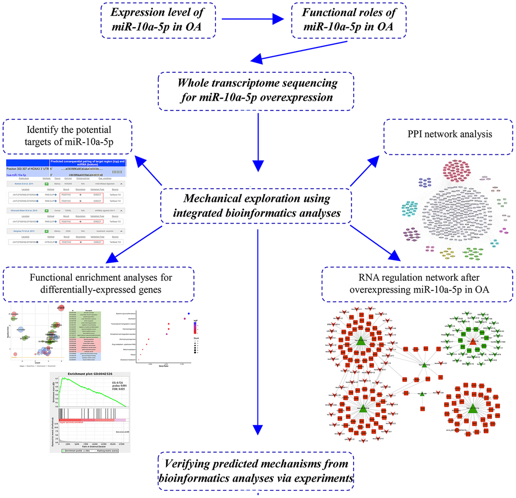 In the current study, we verified that miR-10a-5p was significantly upregulated in OA and acted as a potential promising biomarker. Furthermore, we found that miR-10a-5p inhibited chondrocyte proliferation and promoted chondrocyte apoptosis. To in-depth explore the mechanisms of miR-10a-5p in OA, we performed RNA sequence for the whole transcriptome. Subsequently, integrated bioinformatics analyses were employed to illuminate the alterations of the whole transcriptome induced by miR-10a-5p. The workflow of study design is shown in Figure 1. Our findings may open up a new sight into regulatory mechanism of miRNAs, which may provide novel therapeutic targets for OA.